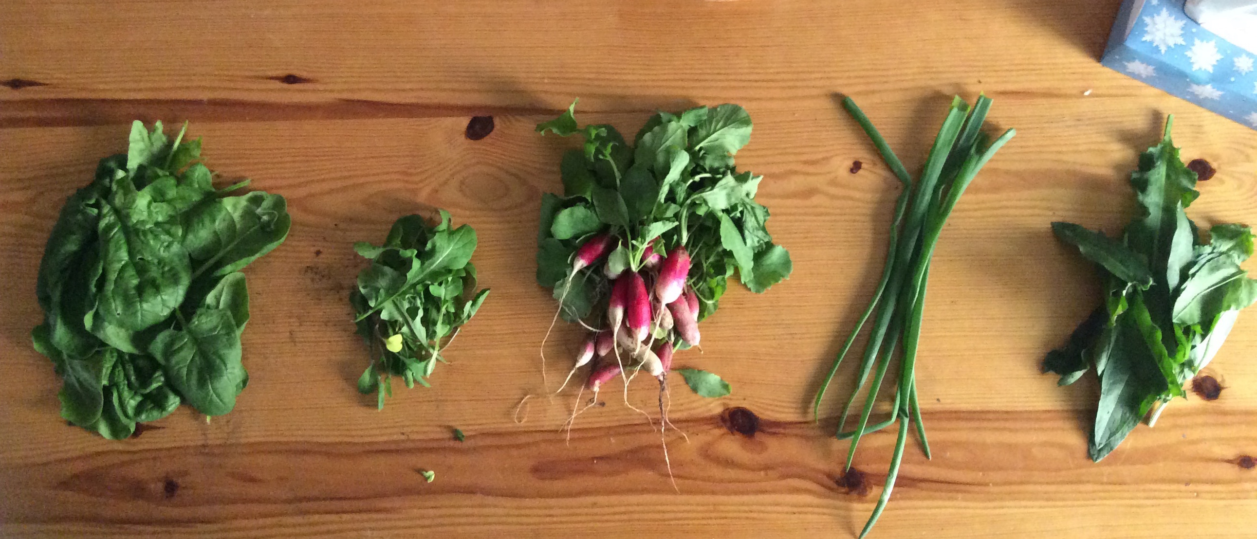 At the moment we are eating pea leaves, shallot leaves, spinach, radish, strawberries, mint, parsley, coriander, rocket & dill. I also like to add some wild sorrel leaves, dandelion flowers & violet flowers to my salads at this time of year.