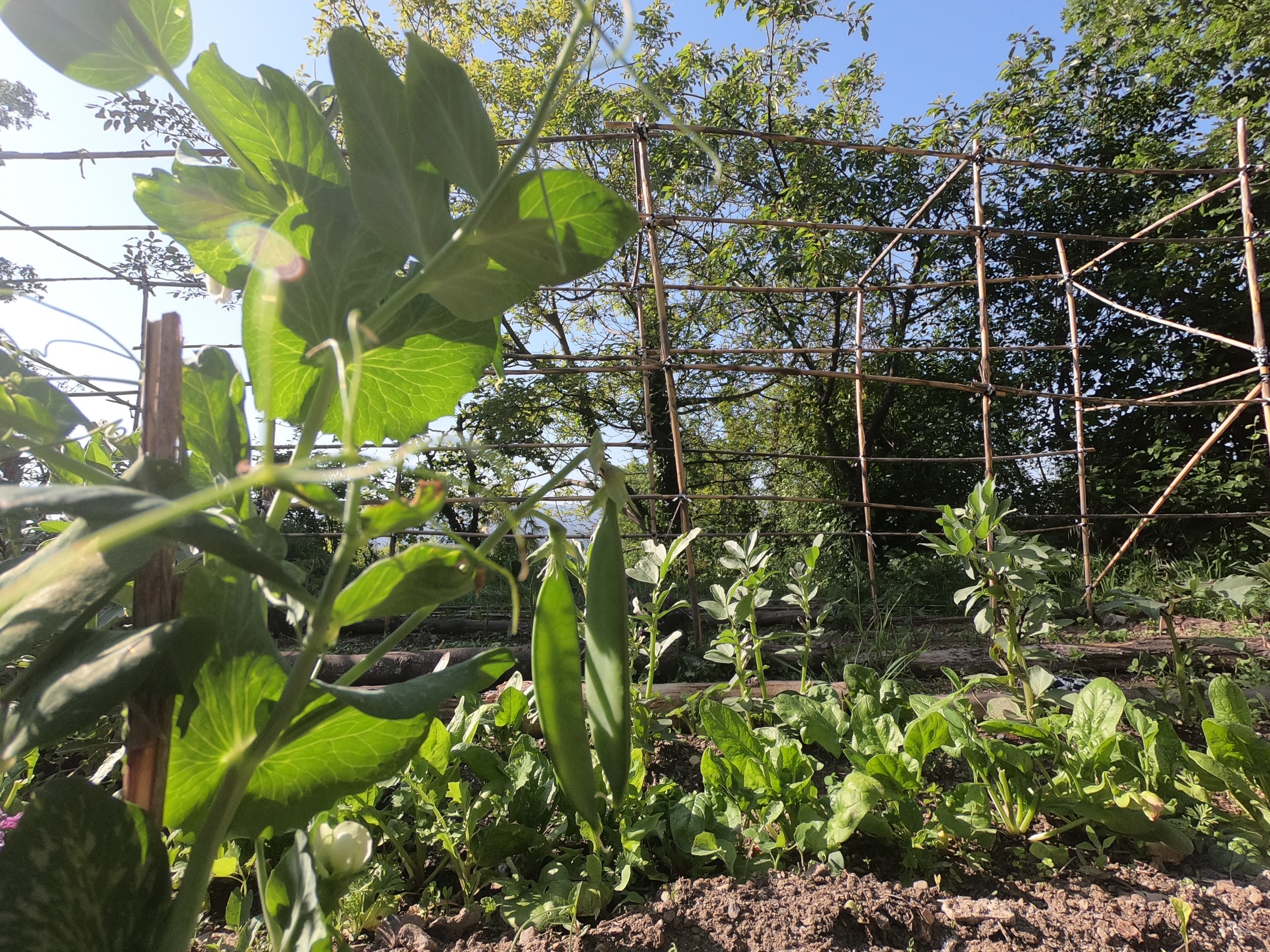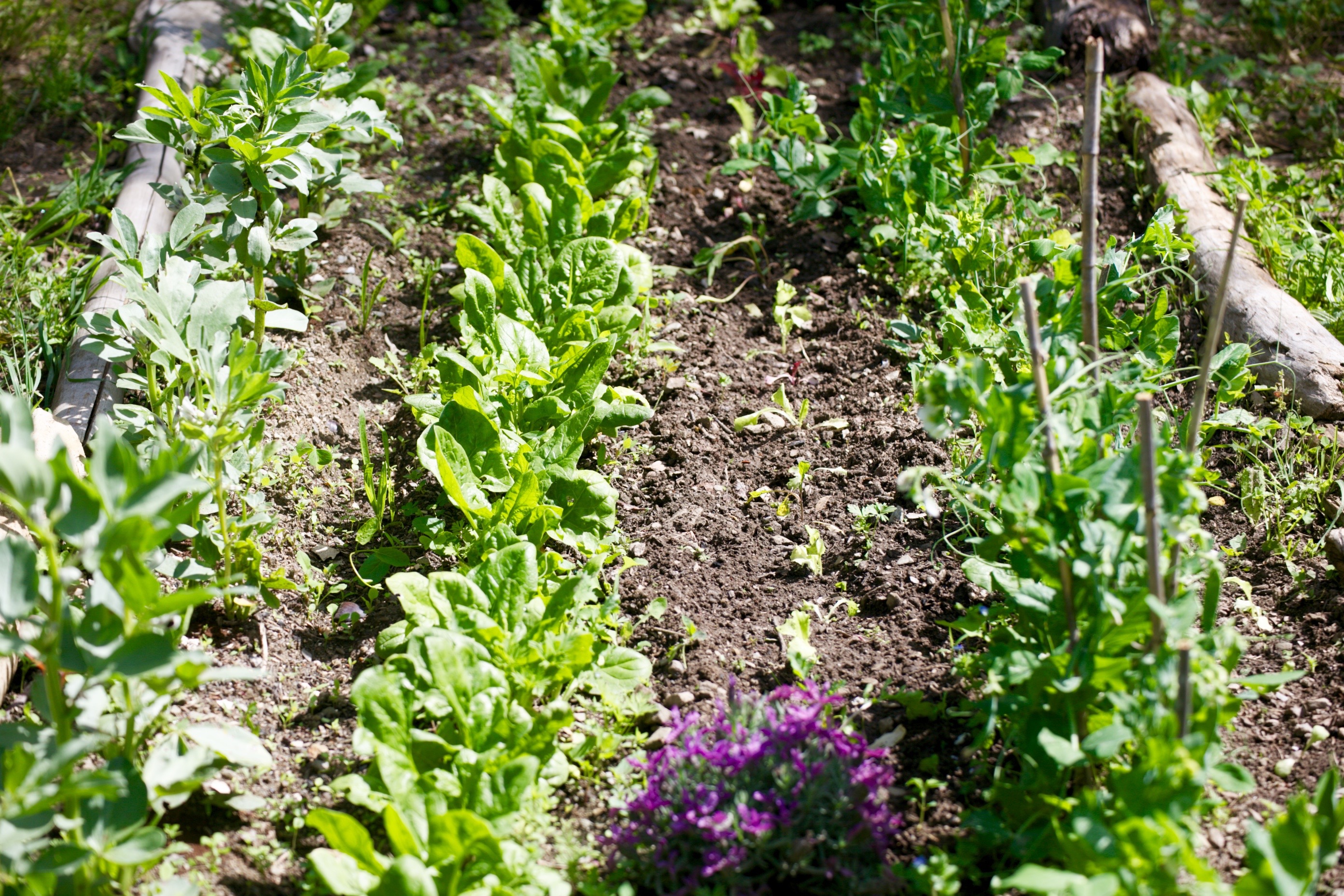 Beans, spinach, freshly transplanted lettuce & peas.