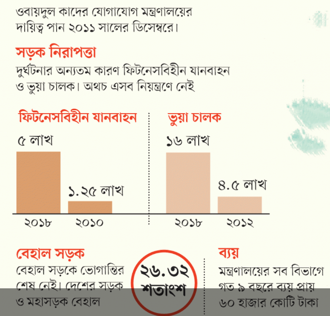 ওবায়দুল কাদের সড়ক পরিবহন ও সেতুমন্ত্রীর দায়িত্বে আছেন সাত বছর। এই মন্ত্রণালয়ের বর্তমান সচিব নজরুল ইসলাম পরিবহন খাতের নিয়ন্ত্রক সংস্থা বাংলাদেশ সড়ক পরিবহন কর্তৃপক্ষের (বিআরটিএ) চেয়ারম্যানের দায়িত্বে ছিলেন প্রায় তিন বছর। বিআরটিএর বর্তমান চেয়ারম্যান মশিয়ার রহমান সংস্থাটির পরিচালক ছিলেন ছয় বছর। প্রায় দুই বছর ধরে তিনি সংস্থাটির চেয়ারম্যান। বিআরটিএর ঢাকা ও এর আশপাশের পরিবহনব্যবস্থা নিয়ন্ত্রণের দায়িত্ব মিরপুর কার্যালয়ের। এই কার্যালয়ের মূল দায়িত্বে যে কর্মকর্তা, তিনিও সেখানে নানা দায়িত্বে আছেন প্রায় সাত বছর ধরে। মন্ত্রণালয় ও বিআরটিএর গুরুত্বপূর্ণ পদগুলো দীর্ঘদিন ধরে অলংকৃত করছেন এই কয়েকজন ব্যক্তি।