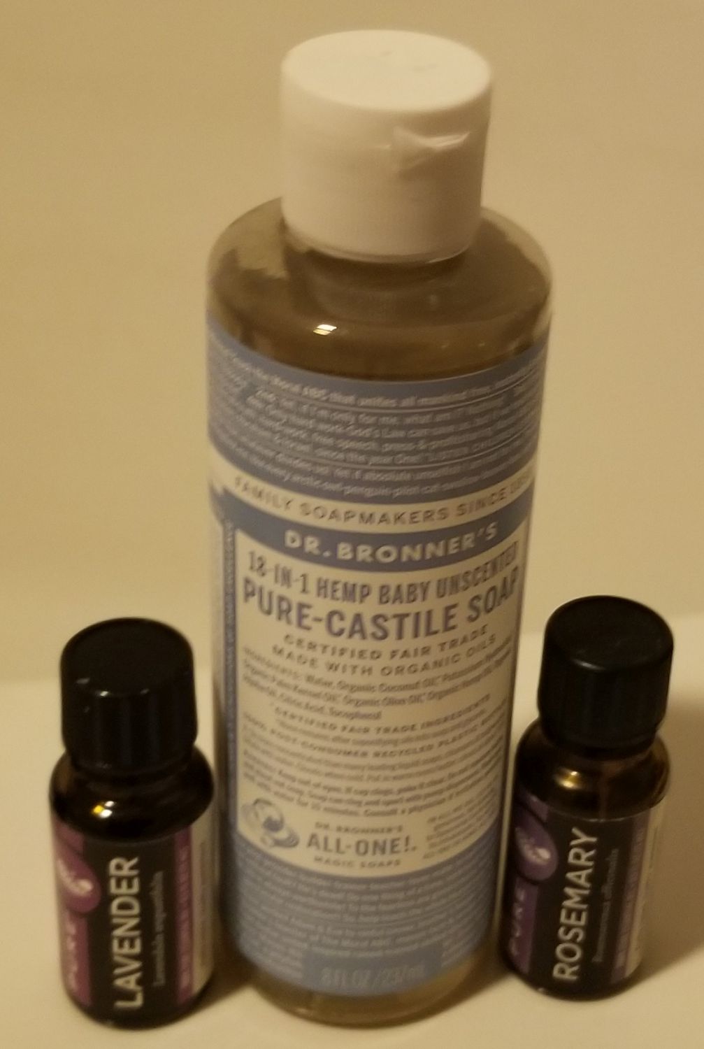 To refill, add a small amount of Dr. Bronner's liquid 18-in-1 hemp pure castille soap, which I have loved and used for decades. I already had three bottles of it on hand; lavender, peppermint, and baby unscented. I chose the latter for this purpose, and filled the container roughly 11/8 to 1/6 full, then added hot tap water until nearly full.