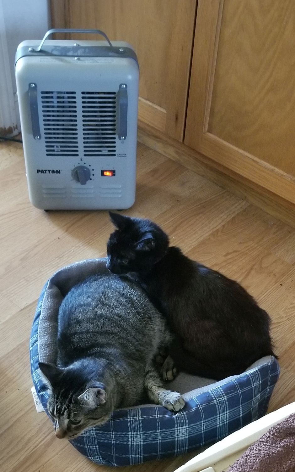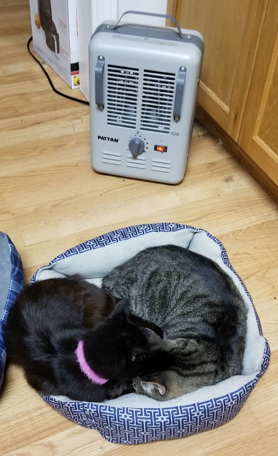 The kitties in their pretty bed by the portable heater - #loveit