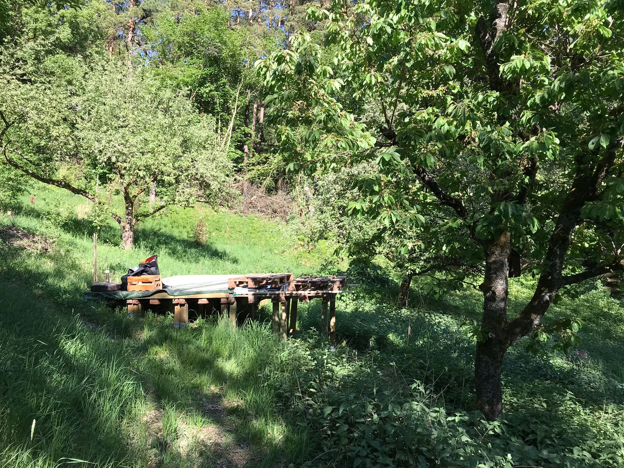 I own an estate used as a little natural resort, near the famous „Jacobsweg“ at Gräfensteinberg in Bavaria. The size is about 4000 square meter. To stay there in a comfortable manner I built two platforms where you can sit, eat, be creative, hear the birds or simply watch the nature.