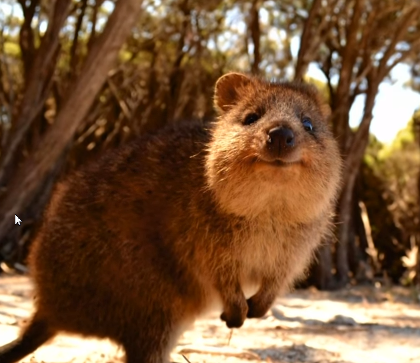 Самое счастливое животное на планете - это всегда улыбающаяся квокка . Это короткохвостый кенгуру , который живет на самом крайне юго-западе Австралии . Встречается и на окраине материка , и также на островах такие как Роттнест и Палм. Квокки совсем не боятся людей, если вы побываете в Австалии и увидите это улыбающееся чудо , то оно от вас не убежит , а наоборот, подойдет к вам, к вашим ногам , начнет вас с интересом обнюхивать . Из-за такой доверчивости Квокку часто сажали в клетки , держали дома . Но это очень вредит их популяции, поэтому сейчас в австралии запрещено к Квокам приближаться и вам даже могут выписать штраф , если вы его ласково погладите.