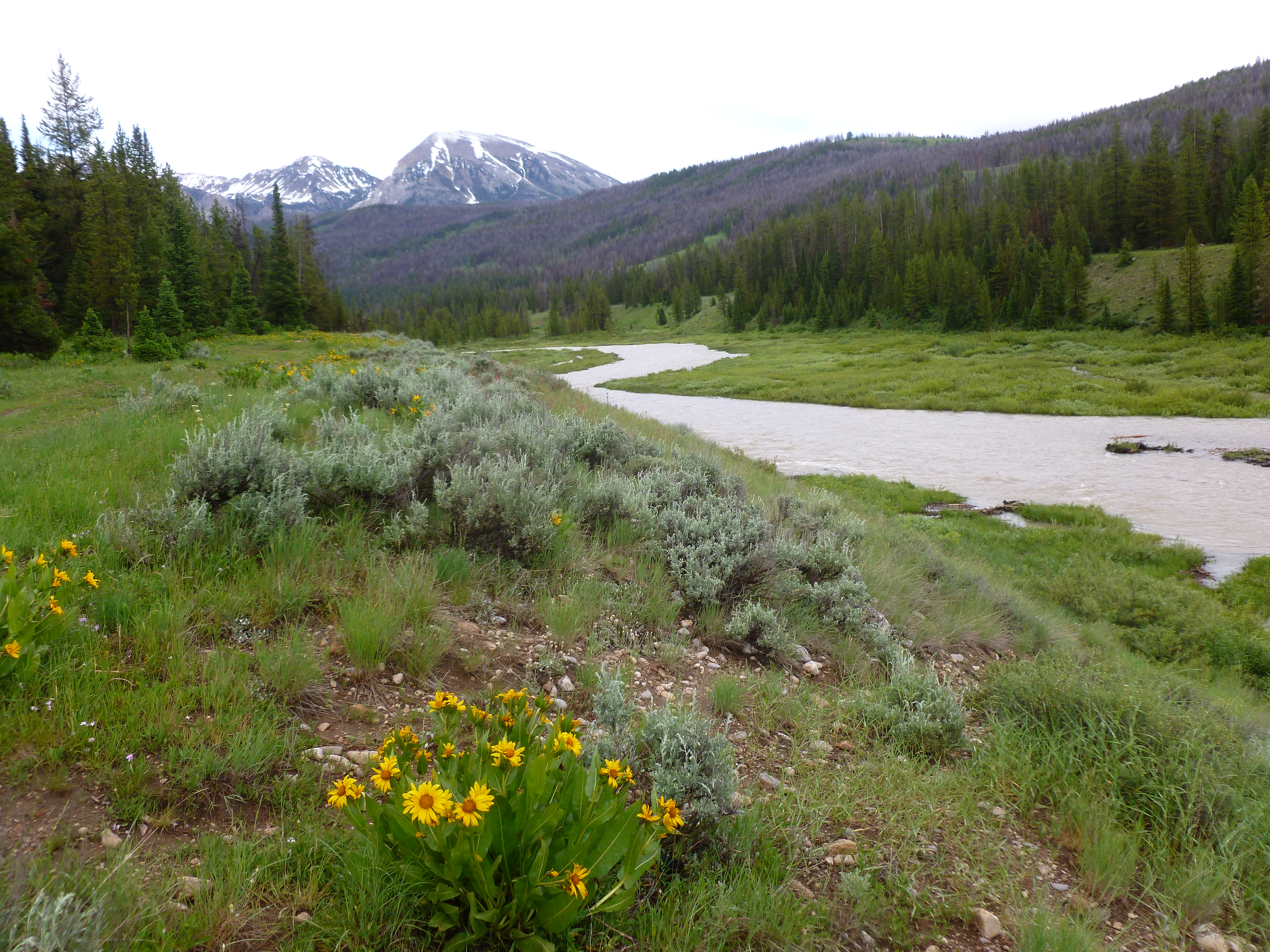 After our soak we headed a ways back down the road, exploring some of the side trails until we found the perfect camp spot overlooking the winding river. The rain let up and the dogs got to run around hunting ground squirrels until they were exhausted and it was time for bed.