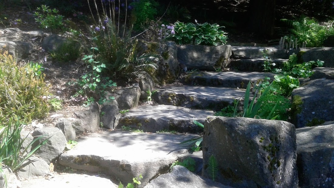Not sure if this is concrete or stone, but it has a natural feel I can appreciate. The step heights are easy to manage and spaced a part enough to take your time as you ascend a short distance. The steps are wide enough allowing crowds to walk past or in opposite directions. The irregular outcroppings of stone give the area a mountainous appearance and provide crevices for many low-growing shade plants to spring out from.