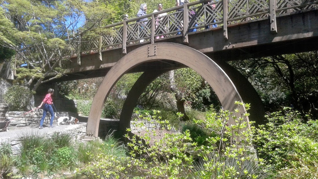 Here we see splendid examples of natural wood walkways, concrete pond walls, stacked stone walls, gentle river streams, and a breath-taking half-circle archway. Looking back draws me right back in. The street drawings in the Mary Poppins movie had the same magical effect on children and like-minded adults. You could stay inside forever.