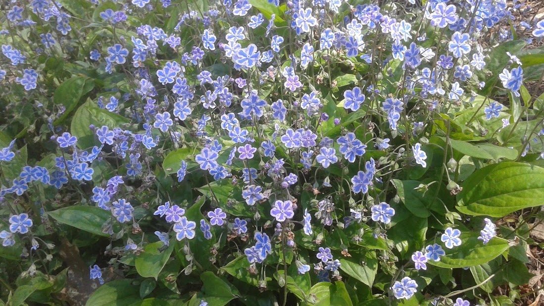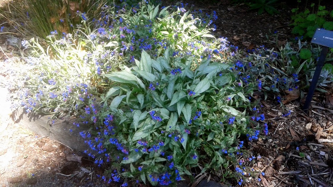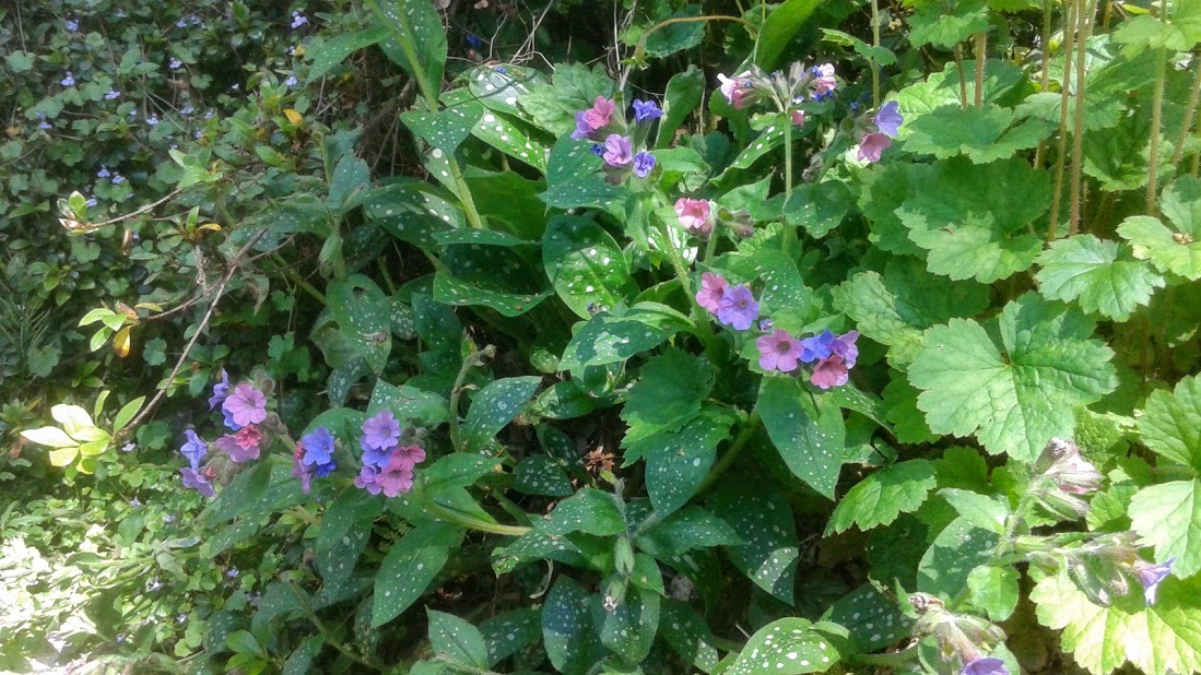 This one below, I recognize as Pulmonaria. Speckled white on leaves. Clusters of magenta flowers that become blue.