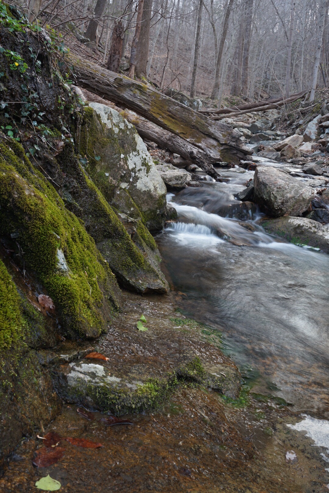 On my daily hike yesterday, I wandered past the ruins of an old mill along the Patapsco River. It sits along a little creek and the much of the scene is covered with moss and English Ivy. Someone suggested in my last post that I try a circular polarizer filter on my Sony A7ii to eliminate the glare of the water and help prevent the blowout of the highlights. I used my 28-70mm kit lens because that’s the only lens I have a CP filter for. It is not as sharp as my wide angle lens, but the softness of the background doesn’t seem to hurt the photo much. I liked the bright green of the moss and the two little ginkgo leaves in the foreground.