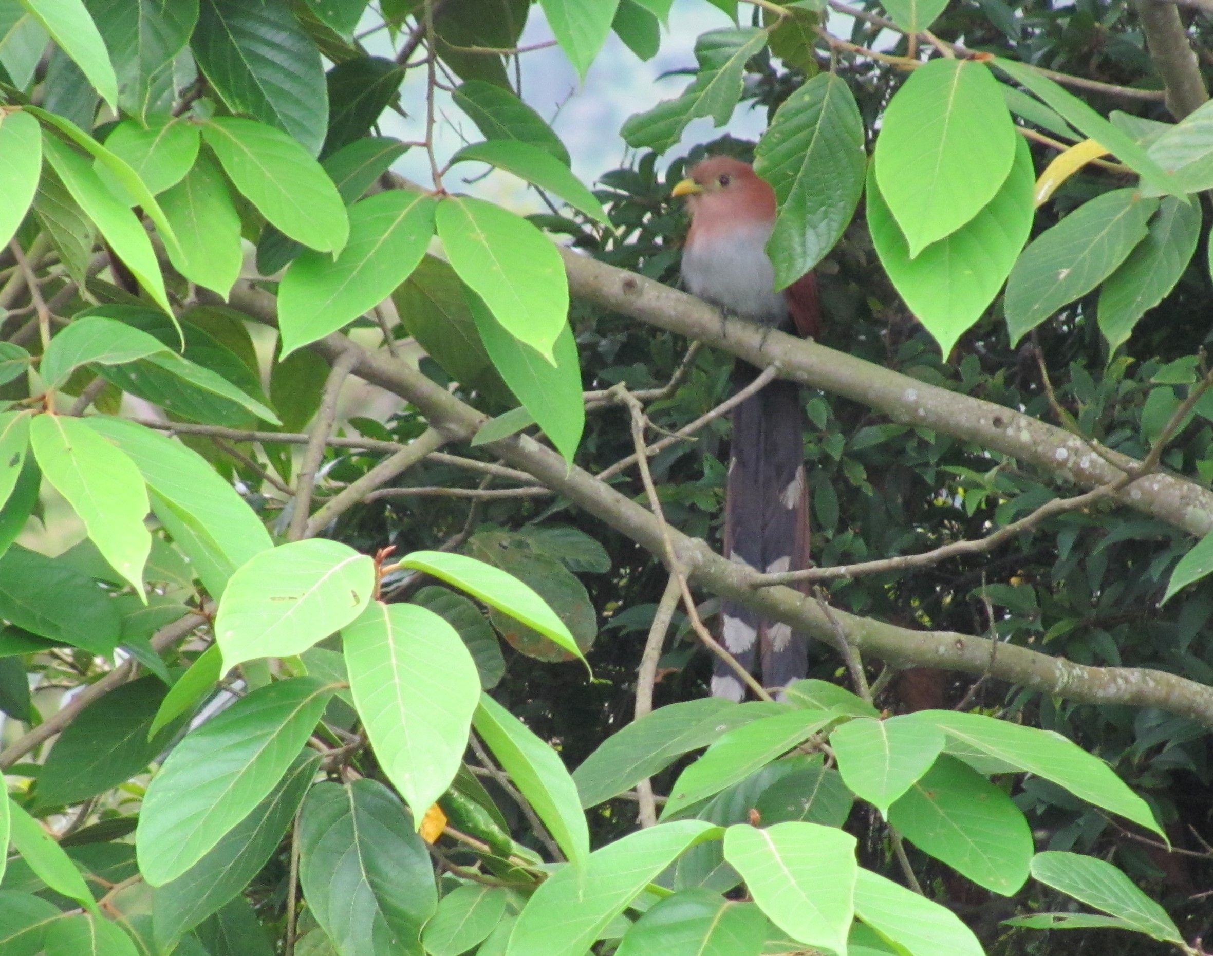 Les presento esta preciosa ave que común mente la llamamos Cuco ardilla, científicamente se le conoce como Piaya cayana, ésta ave la hemos visto desde arriba de la montaña sobre volando el dosel del bosque en cortos recorridos. Parece una ardilla que planea de árbol en árbol. Tiene un color rojizo en su cabeza y parte de su cuerpo, su abdomen y pecho es gris, su pico amarillo y tiene una larga cola por encima de color rojizo como su cuerpo y por debajo tiene color negro con manchas blancas. Puede medir hasta 46 centímetros.