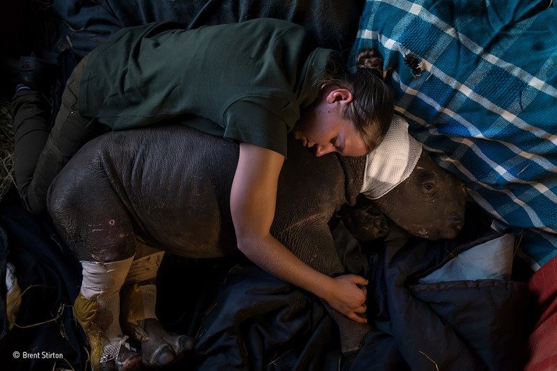 The image was taken in the park of Hluhluwe-Imfolozi, in South Africa. In his series of photographs, Stirton also included volunteers who rescue the offspring of poached rhinos. Here below, Dorota Ladosz embraces Lulah, a one-month-old black rhino whose mother was killed in Kruger National Park. A group of hyenas bit the baby's ears and badly injured his legs. She was taken to the Care for Wild Africa rhino orphanage to be rehabilitated, hoping to return her to nature.