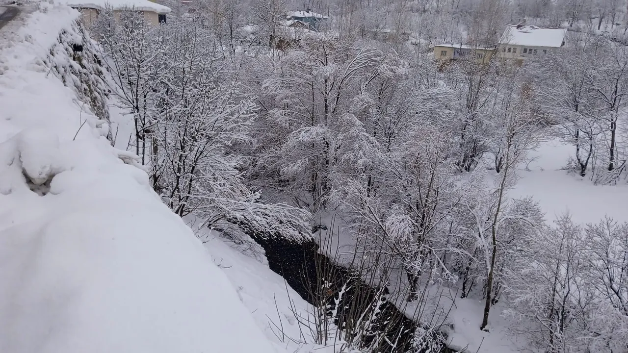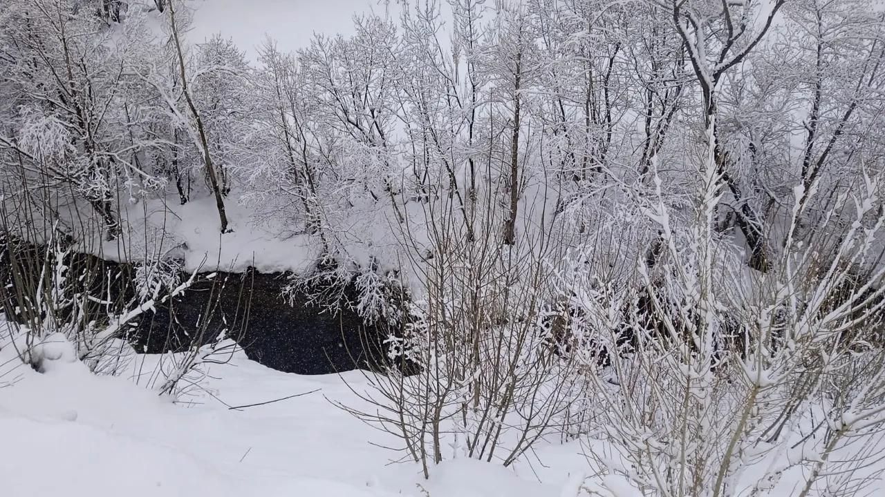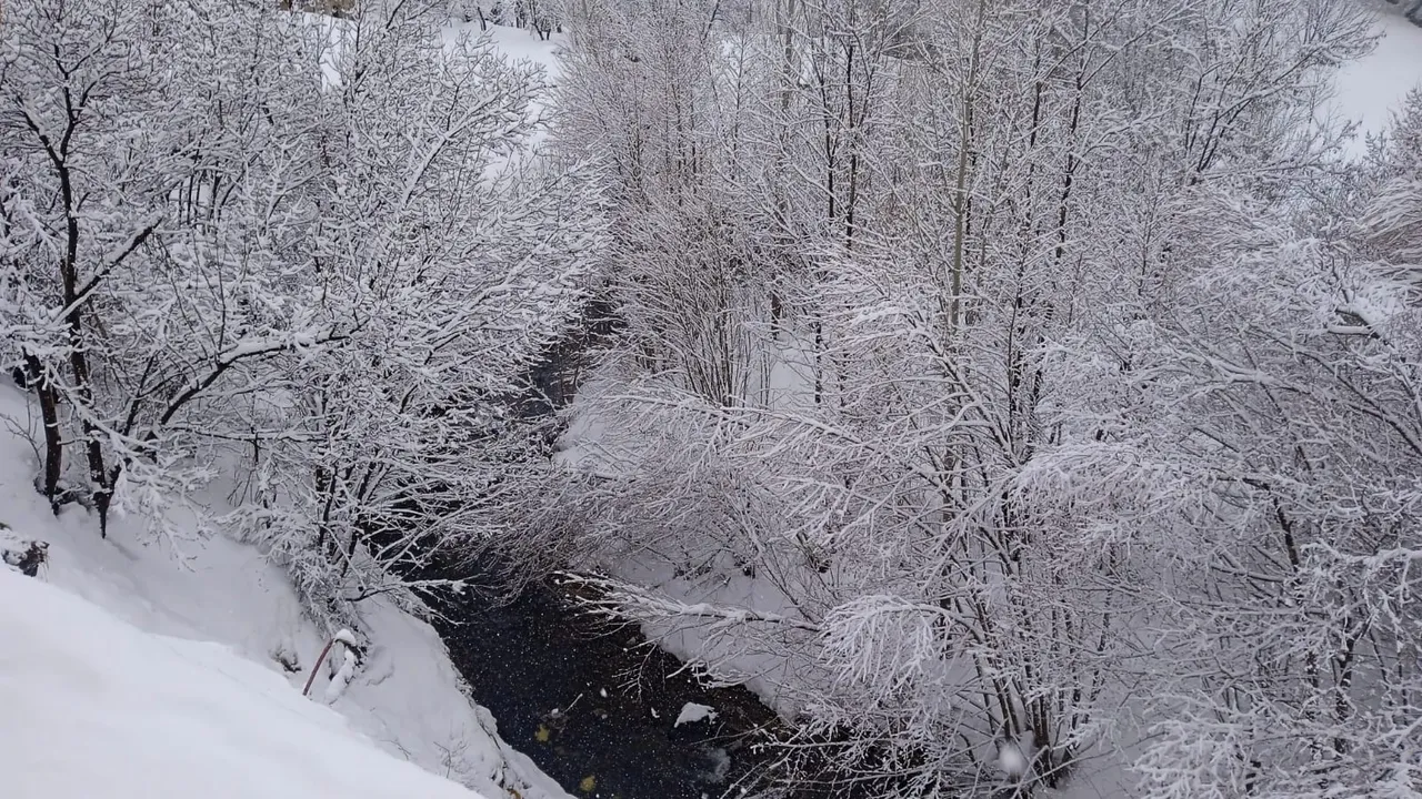 The trees and snow together covered the stream, creating an aesthetically pleasing sight