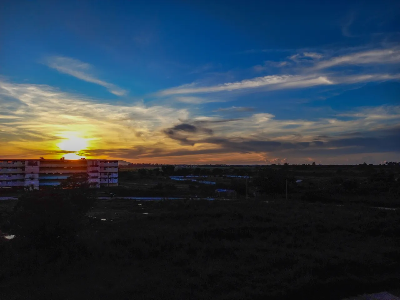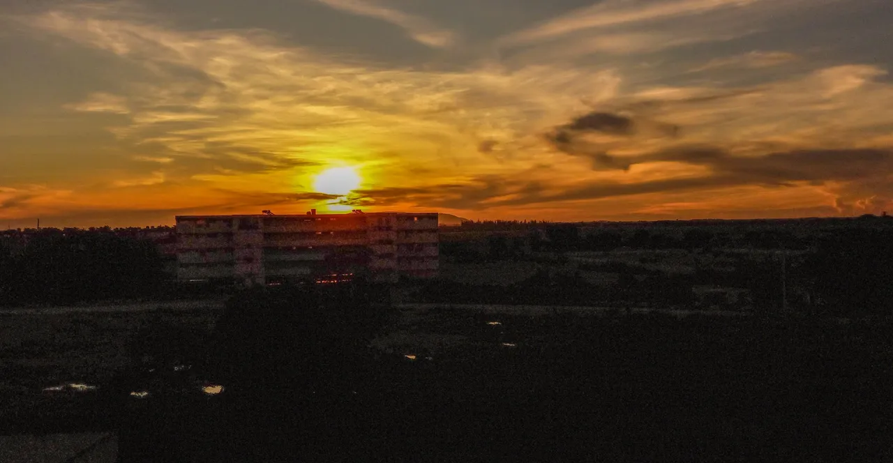 The sky opens up in an explosion of color. The sun rises slowly, almost shyly, behind the horizon, bathing everything in golden tones, intense oranges, and soft pinks. The clouds are stained as if someone had painted them with liquid fire, elongated and dramatic, floating over the awakening landscape. Below, the hospital buildings, the quiet fields, a lonely road... all bathed in that new light that erases the shadows of the night.