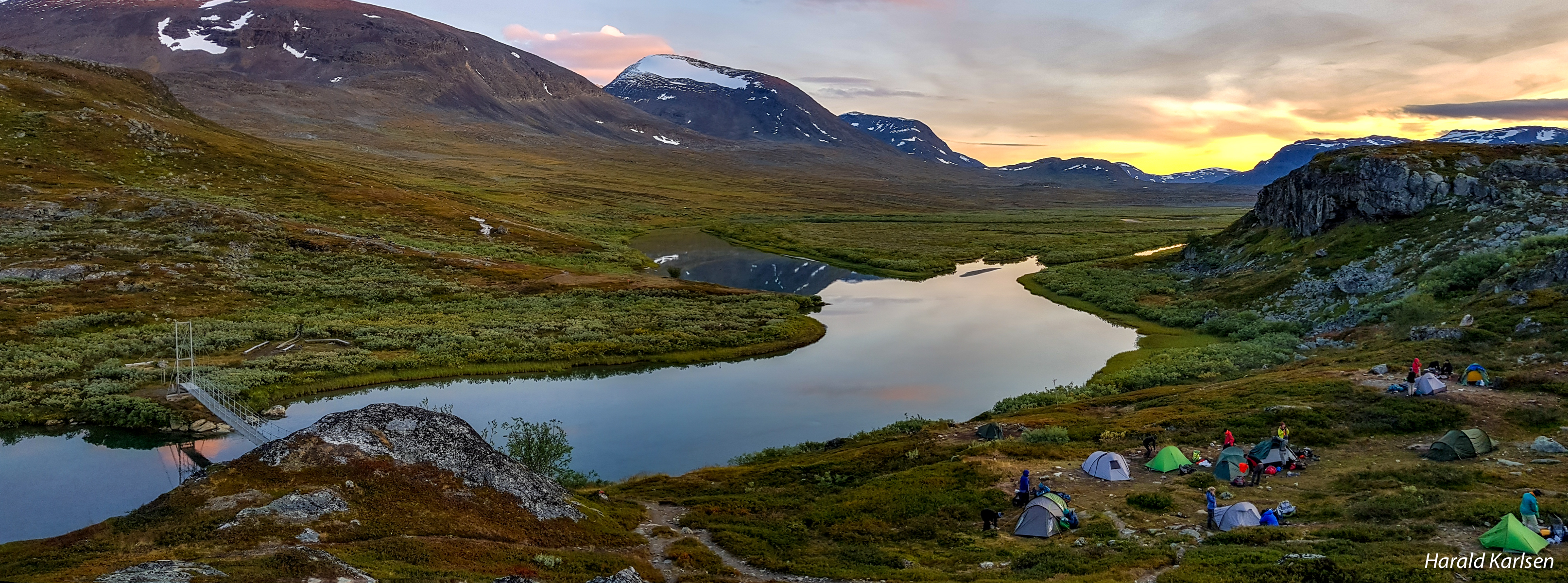 Kungsleden passes through varied landscape in the Lapland mountain world in the border area to Norway. There are dramatic changes along the way between alpine terrain and low-lying mountain birch forest. A journey along Kungsleden takes you through verdant mountain heaths surrounded by tarns and dramatic peaks.