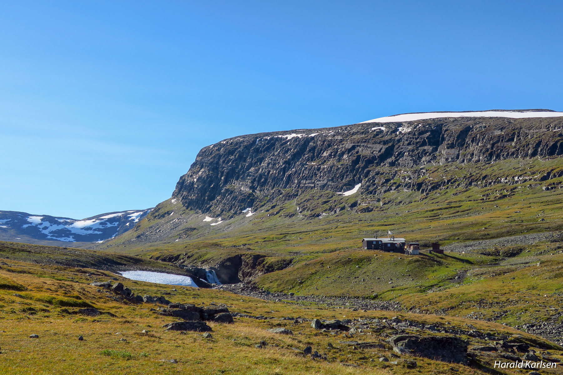We skipped the Tjäkta mountain cabin and walked direct to Sälka and missed the opportunity for a bath in the waterfall next to snow field.
