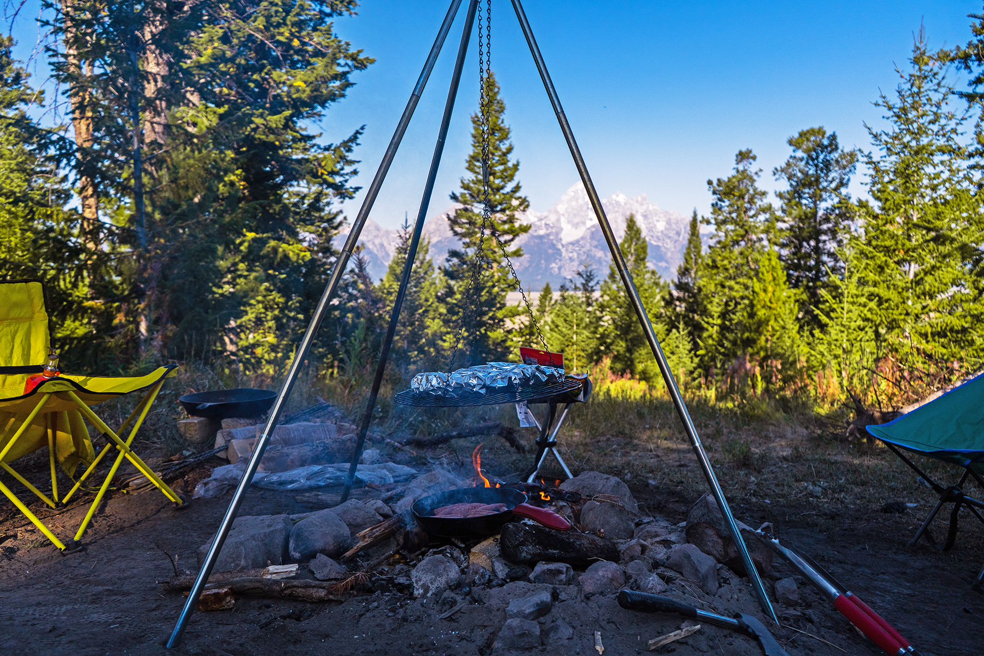 Making a little breakfast meal for the camp crew at our site across the valley from the Grand Teton National Park. The sunrises were gentle but damn were the sunsets beautiful with the sun tucking behind the Tetons.