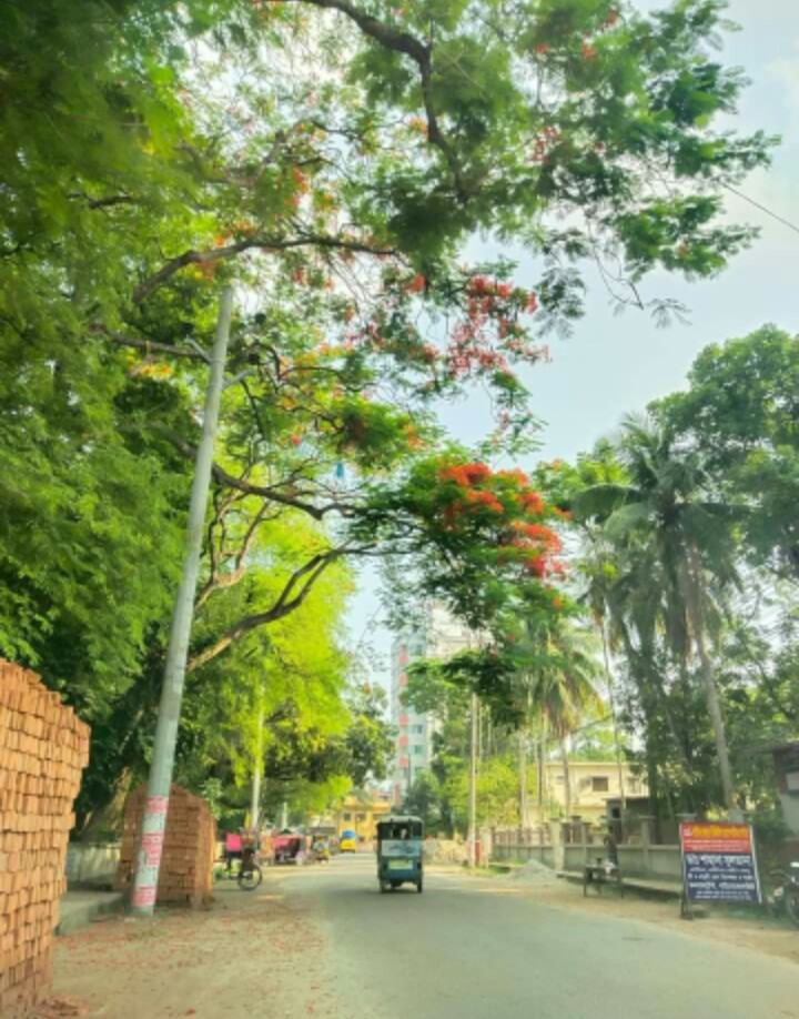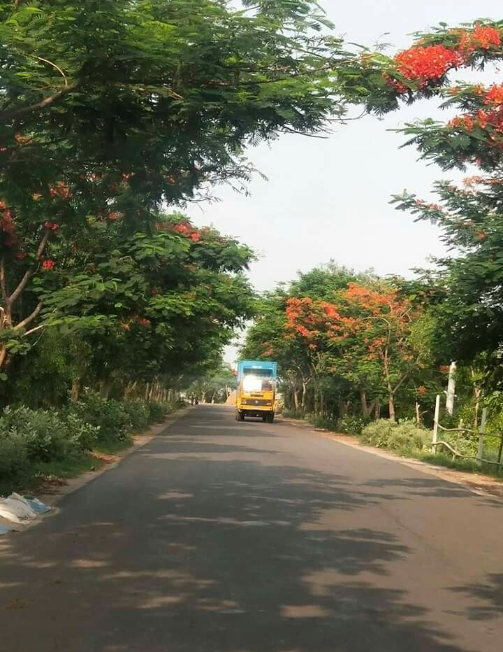 looks this photo, vehicles are coming. road view just awesome. cause two side trees are blossoms flowers. flowers create extra beauties to road. finally i got rickshaw, i also get up and going to hospital. finally i also coming single road. this road tree also blossoms flowers.