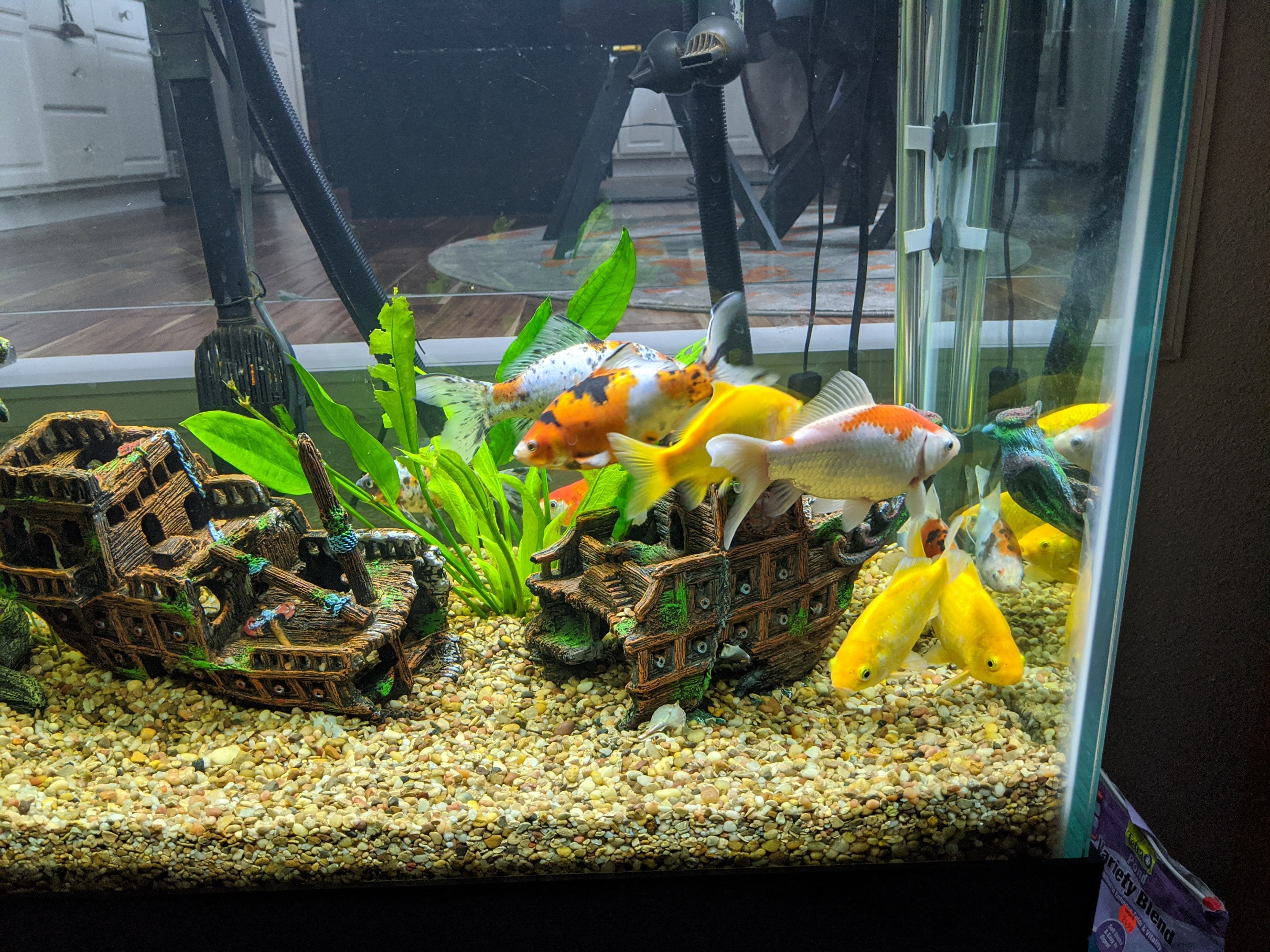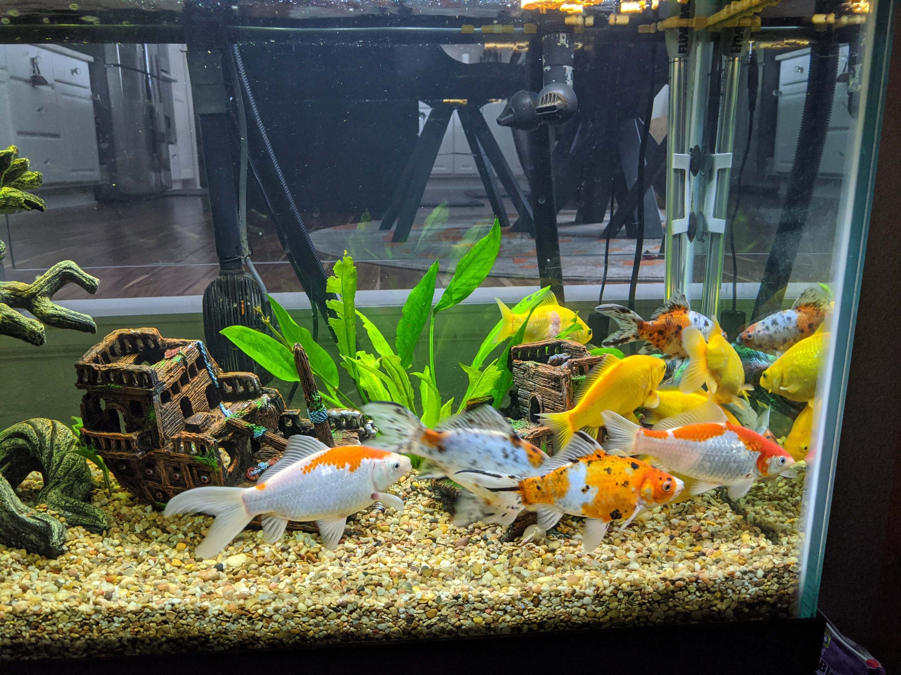 lol, no they are all in the same tank, but it's funny how they seem to stick to their own sides. Although the goldfish have just been kinda all grouping up on the one side of the tank for several weeks now. Not sure about that if anybody knows? Yes, been trying to clean the tank and replenish 20% water change every week, or at least every two cause it starts getting a little cloudy. I bought an oversize filter to extend cleanings, and this was the first time in 3 months so you can imagine how gross it was! Yuk! I'm using a Fluval, sounds like a recommendation to stay away from undergravel, thanks!