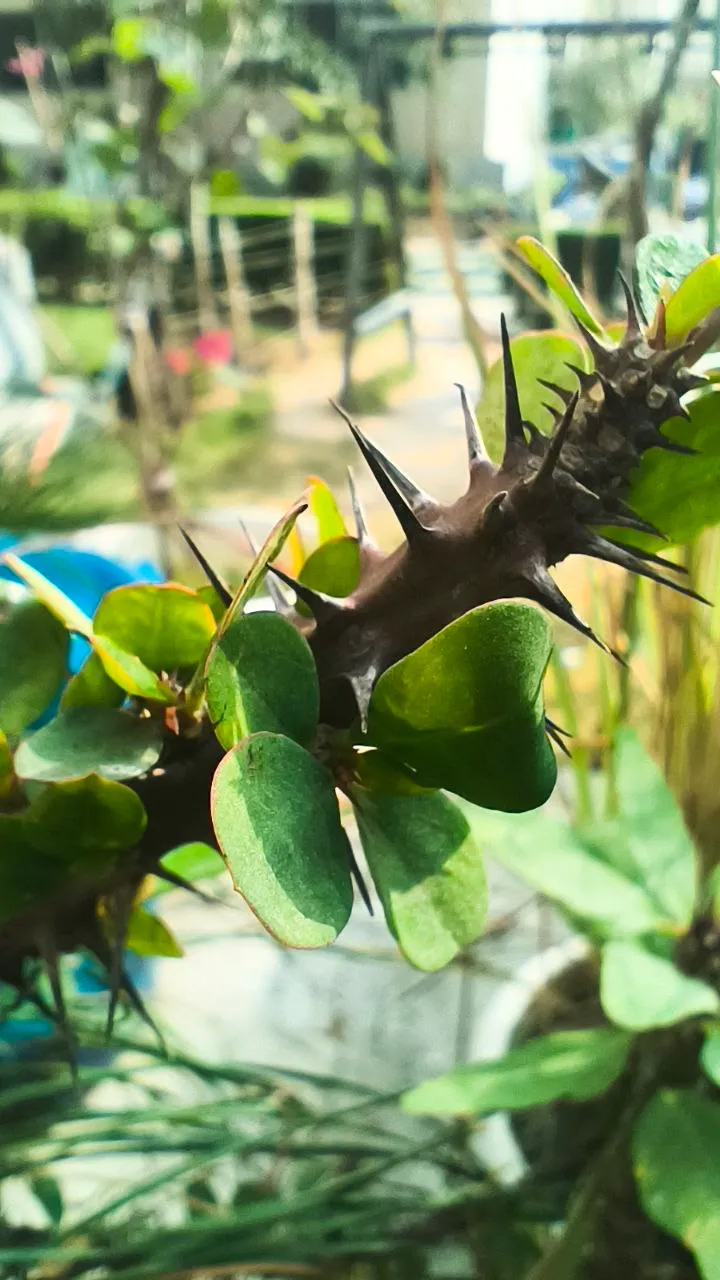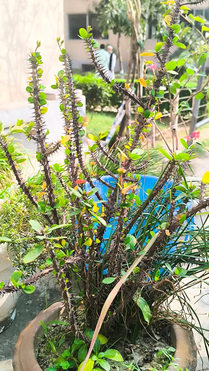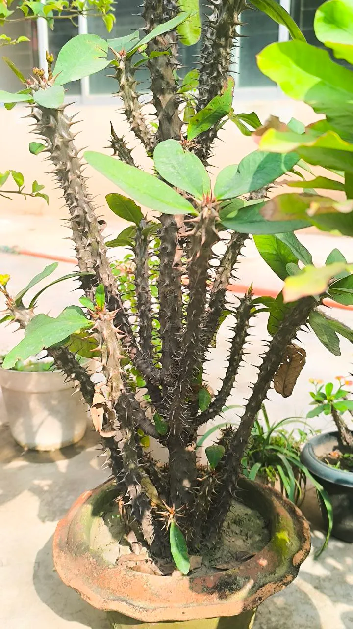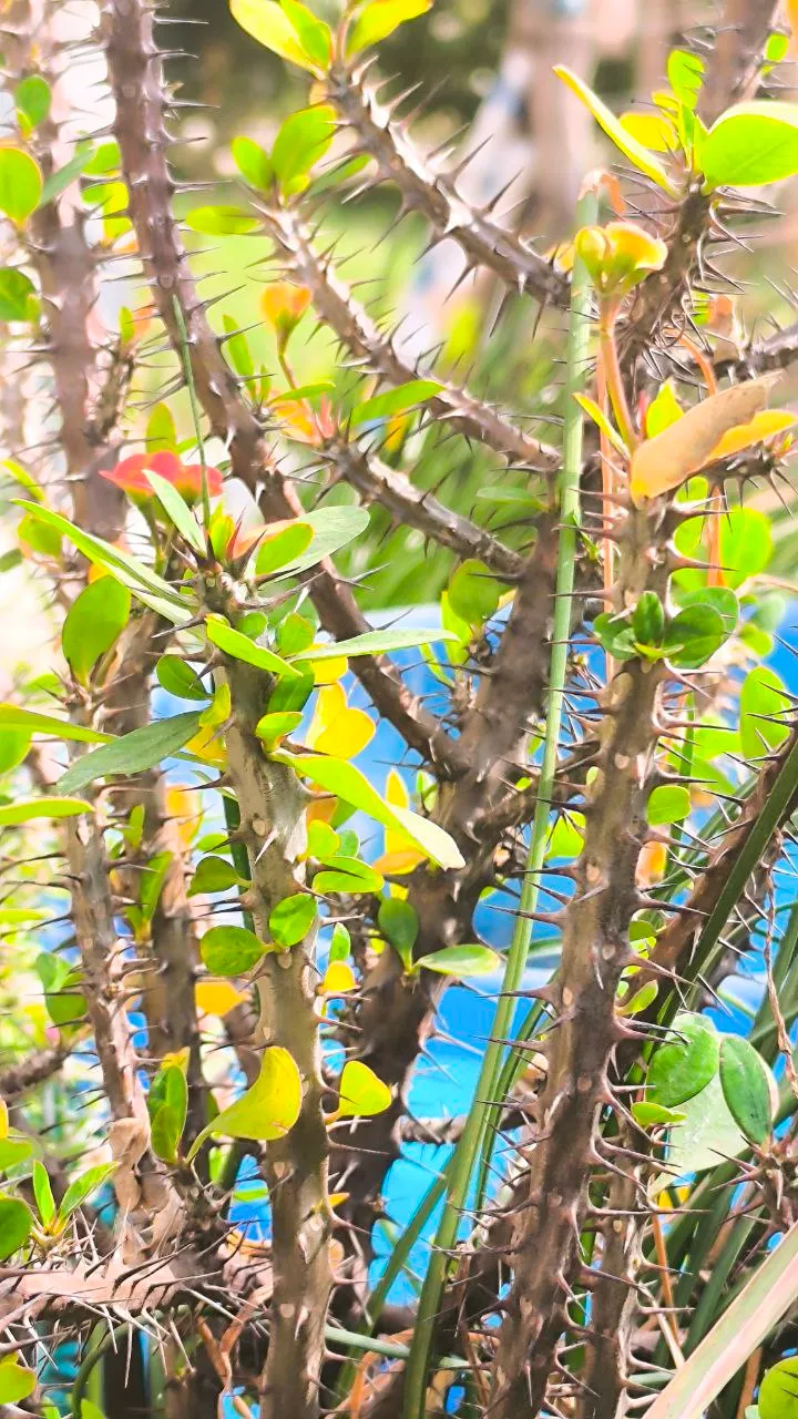 Today I will talk a little about one of my favorite plants. The name of the plant is Crown of Thorns, another name is Euphorbia milii. The plant has many thorns, but still it blooms with small beautiful flowers. That is why I like the plant so much. When I first brought this plant home, it was very small. It was in a small pot, and it didn't have many branches. At that time, I never imagined that one day it would grow so big. I would water it regularly and keep it in the sun. Slowly the plant started growing.
