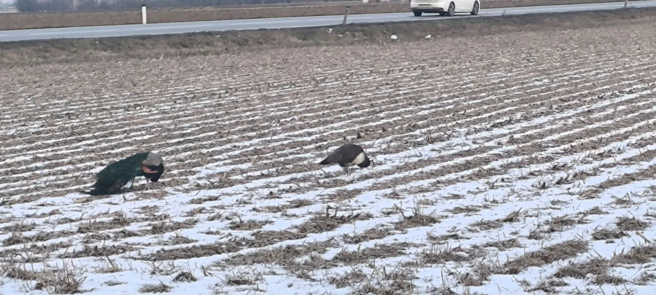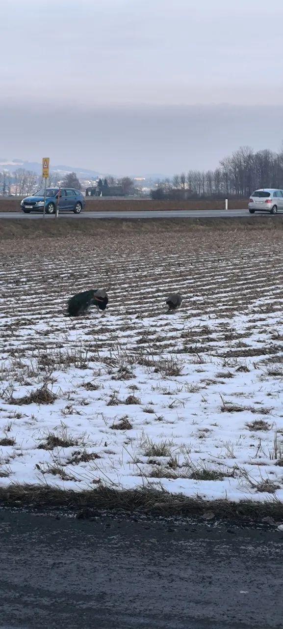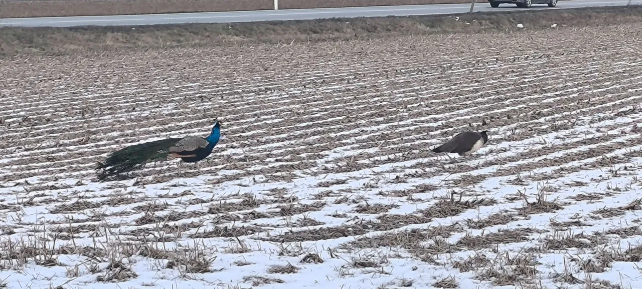Yesterday when I drove to work I saw two peacocks in a field near the airport. I assume they fled from captivity somewhere close. Since these birds don't belong here in Austria. But a lot of people stopped and took a look at them. Unfortunately I only had my smartphone with me.