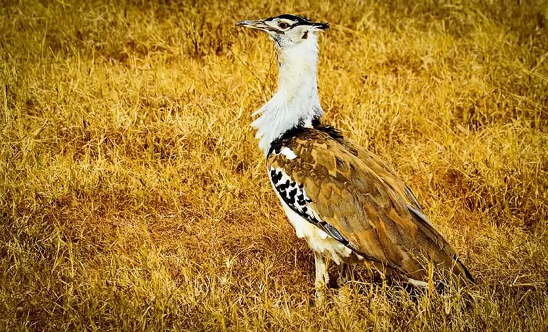 Insects are the main food of kori bustard. Their diet also includes lizards, snakes, seeds, and berries. Unlike other birds, kori bustard drinks water by sucking motion. Kori Bustard spends most of the time in the land, usually in searching for insects in grasslands.