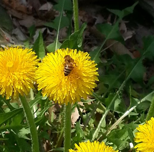Go ahead bee, take all you can and help pollinate this kind of beneficial flower around. Mr. Bee please help Miss Dandelion to reproduce itself by your traveling from there to another flower. take away and carry pollen amd help it spread around so more and more dandelions will appear and share their beauty and benefits.