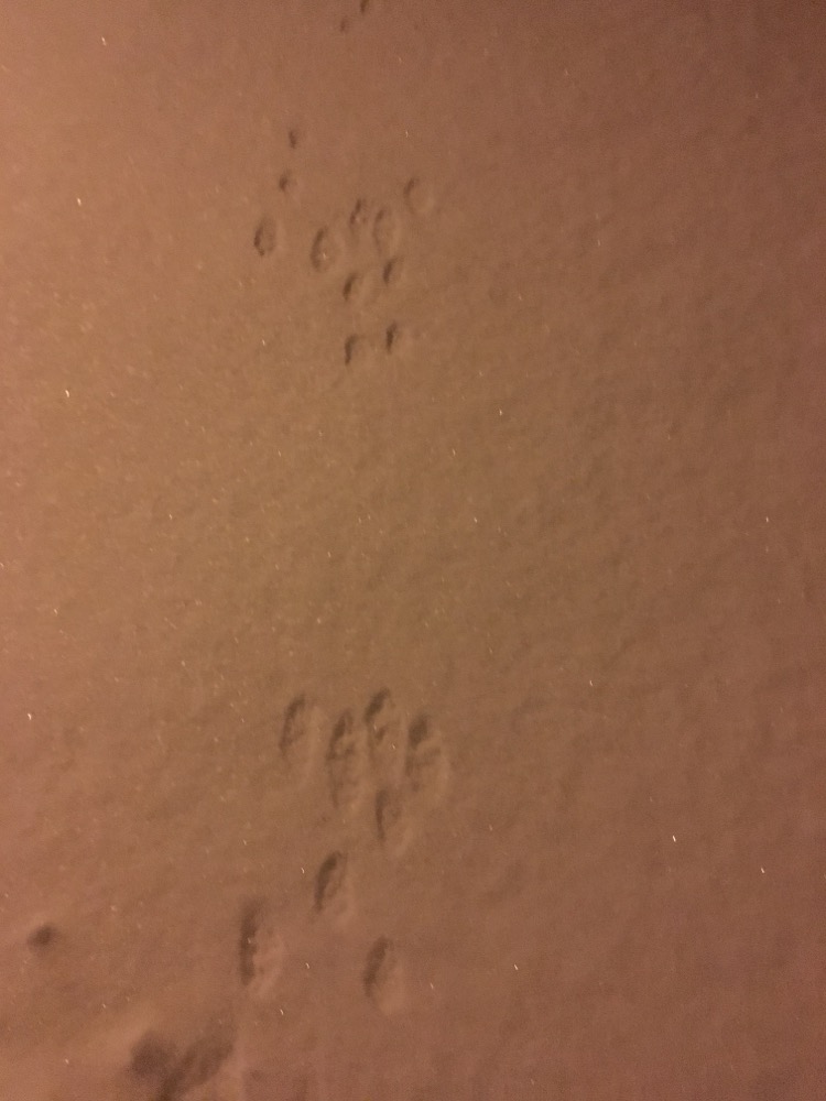 In my yard I saw these tracks in the snow. I think that they are rabbit footprints. I’ve often seen rabbits in my yard. The tracks seem like the animal stopped and hopped on the spot before hopping very far. Usually I think that rabbit tracks are in a four print pattern with big gaps in between sets of four paw prints.