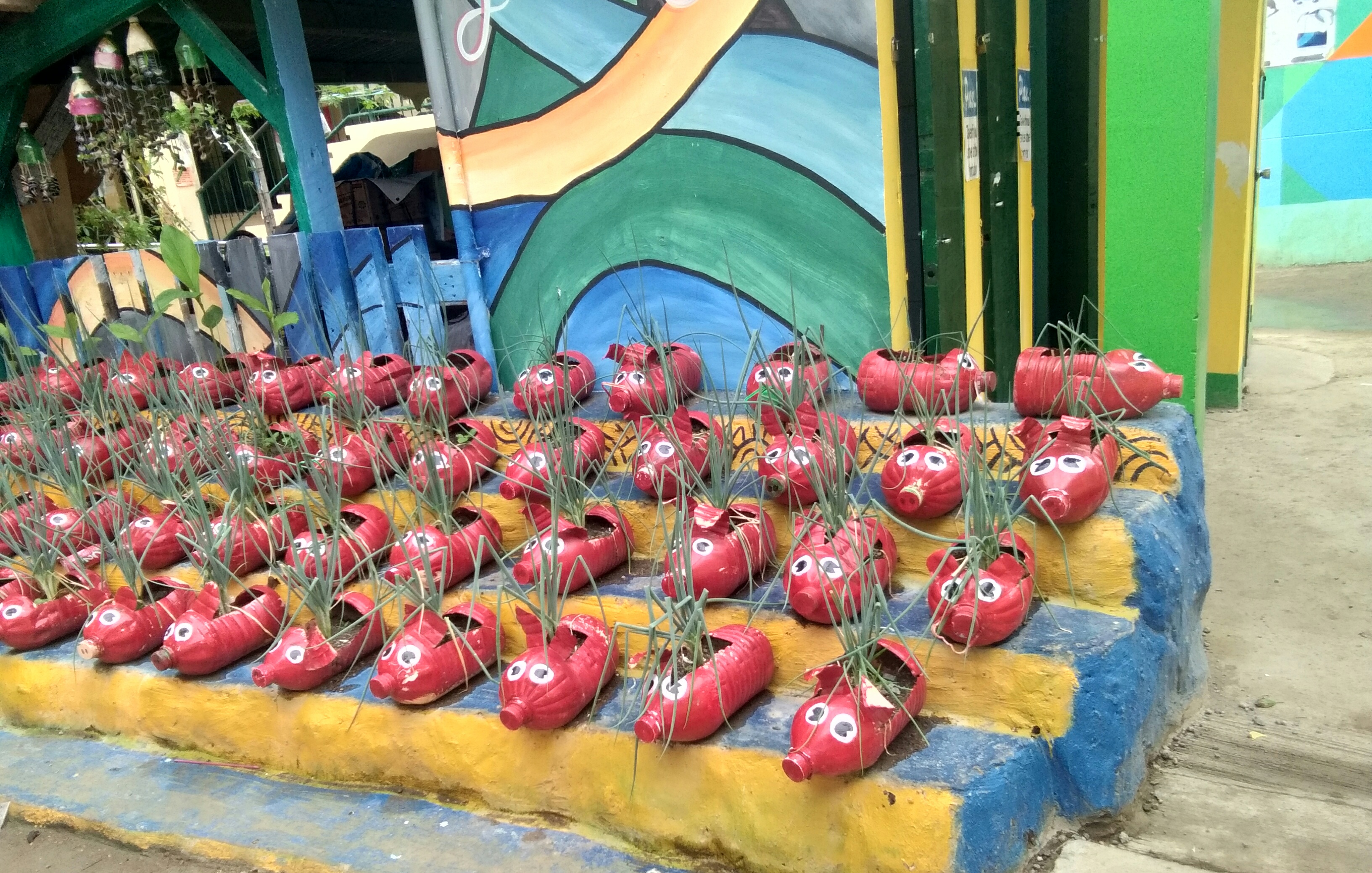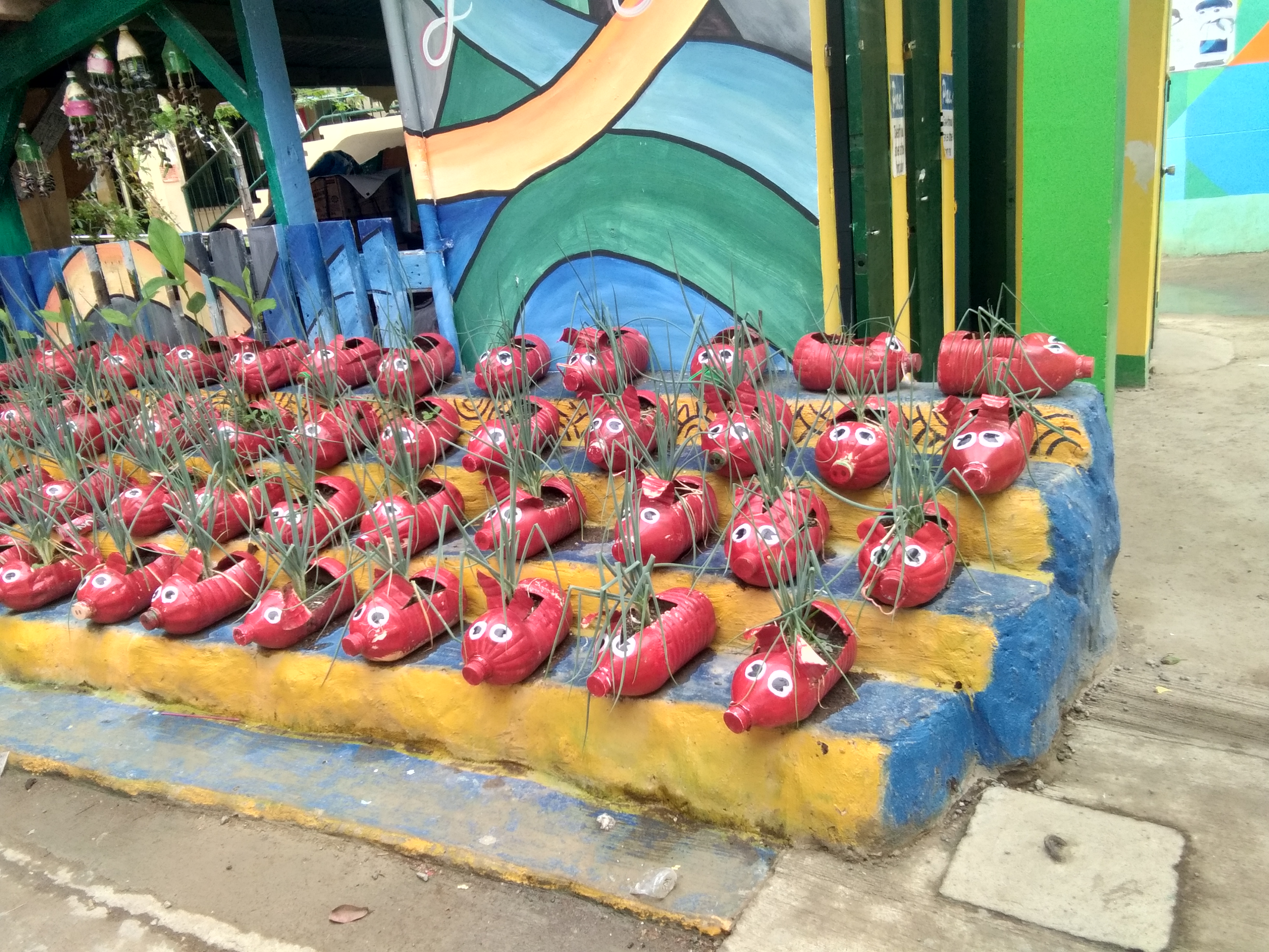 Recycled Plastic Bottlesnunilon (45)in #nature • 8 years ago I was amazed by these cute recycled plastic bottles made into 🐷 designed pots. These photos are mine which I took last Saturday at Marigondon Elementary School. The students planted some spring onions on it last year. #art #steemph #recycling #philippines