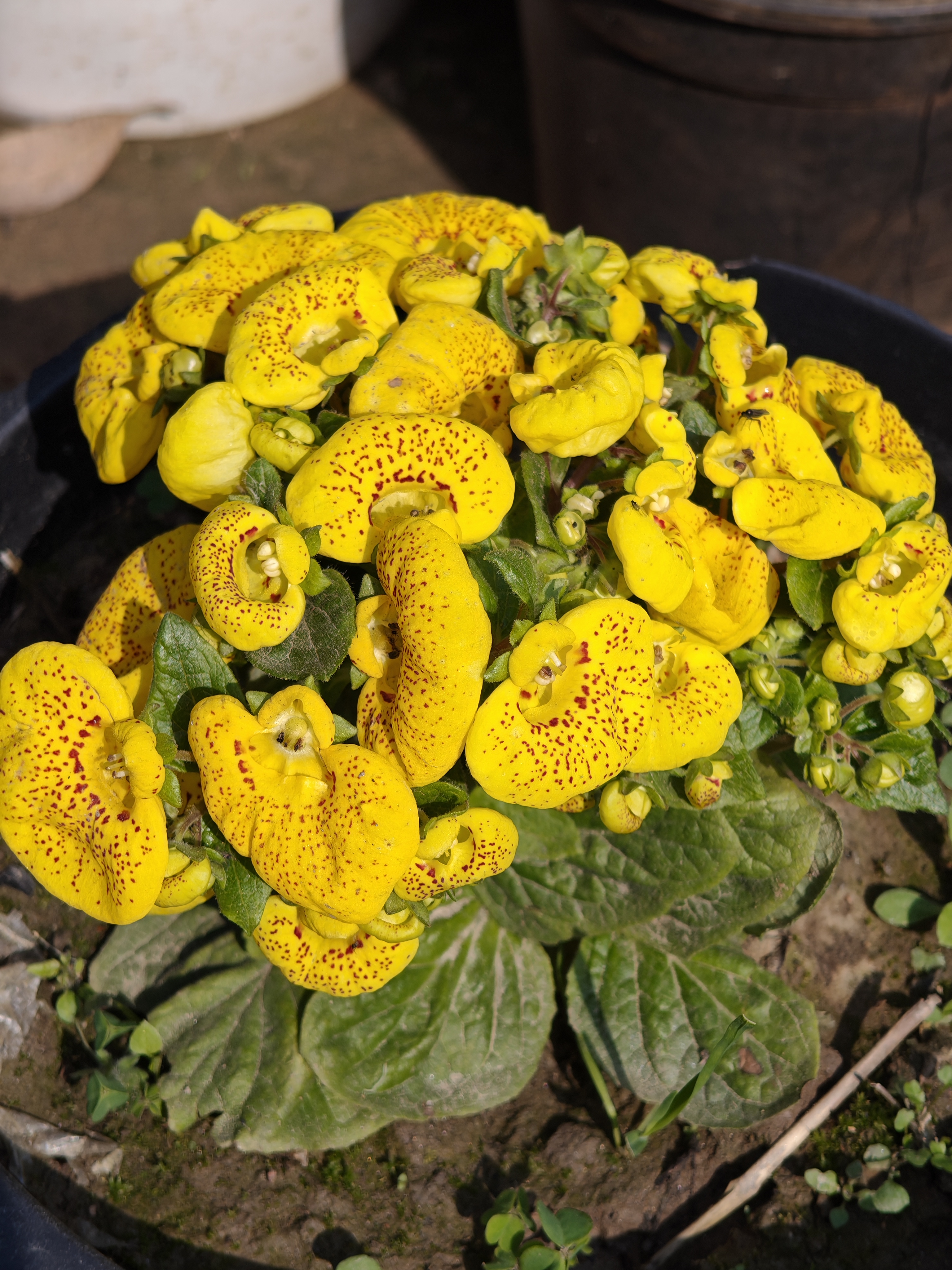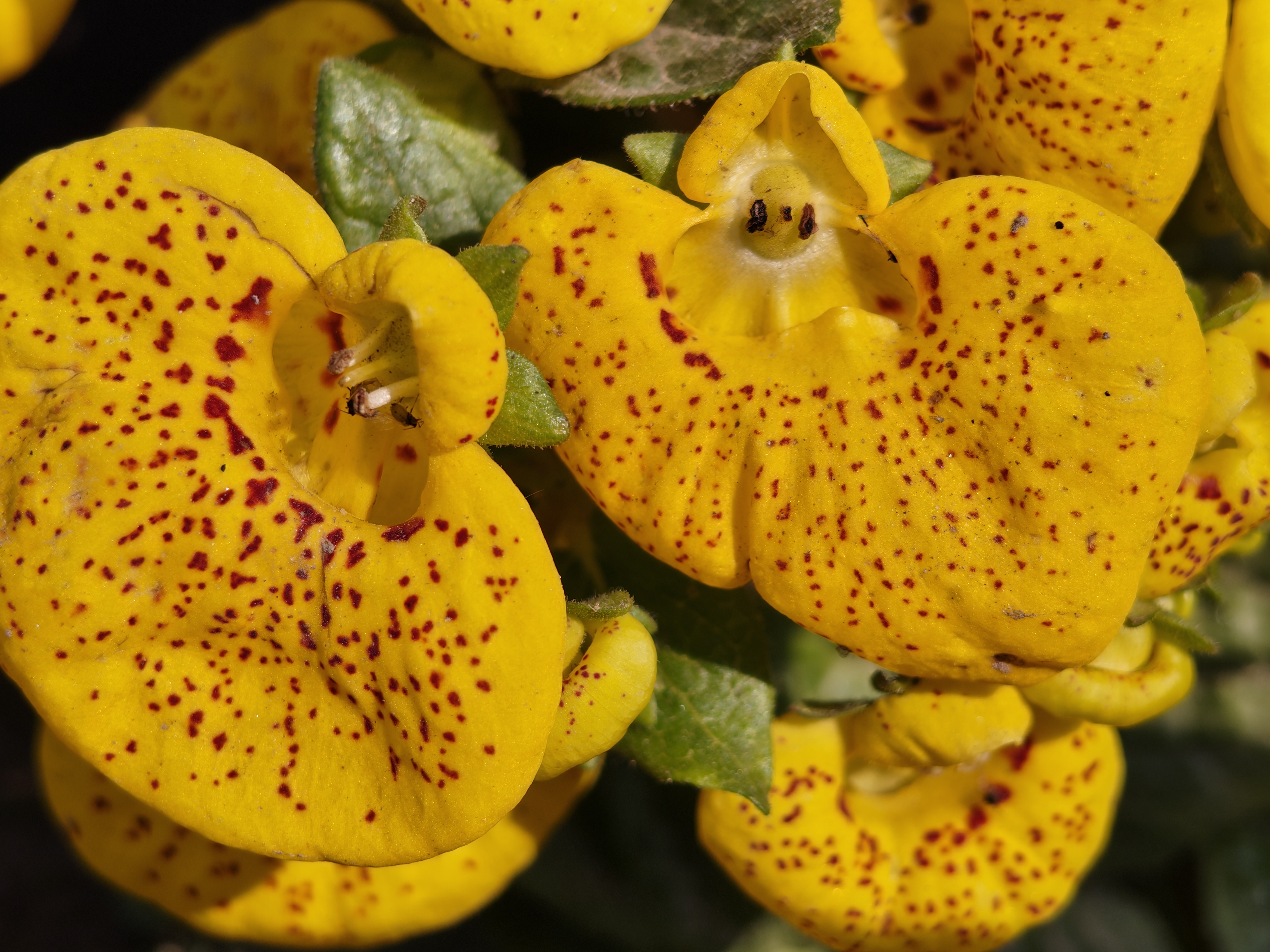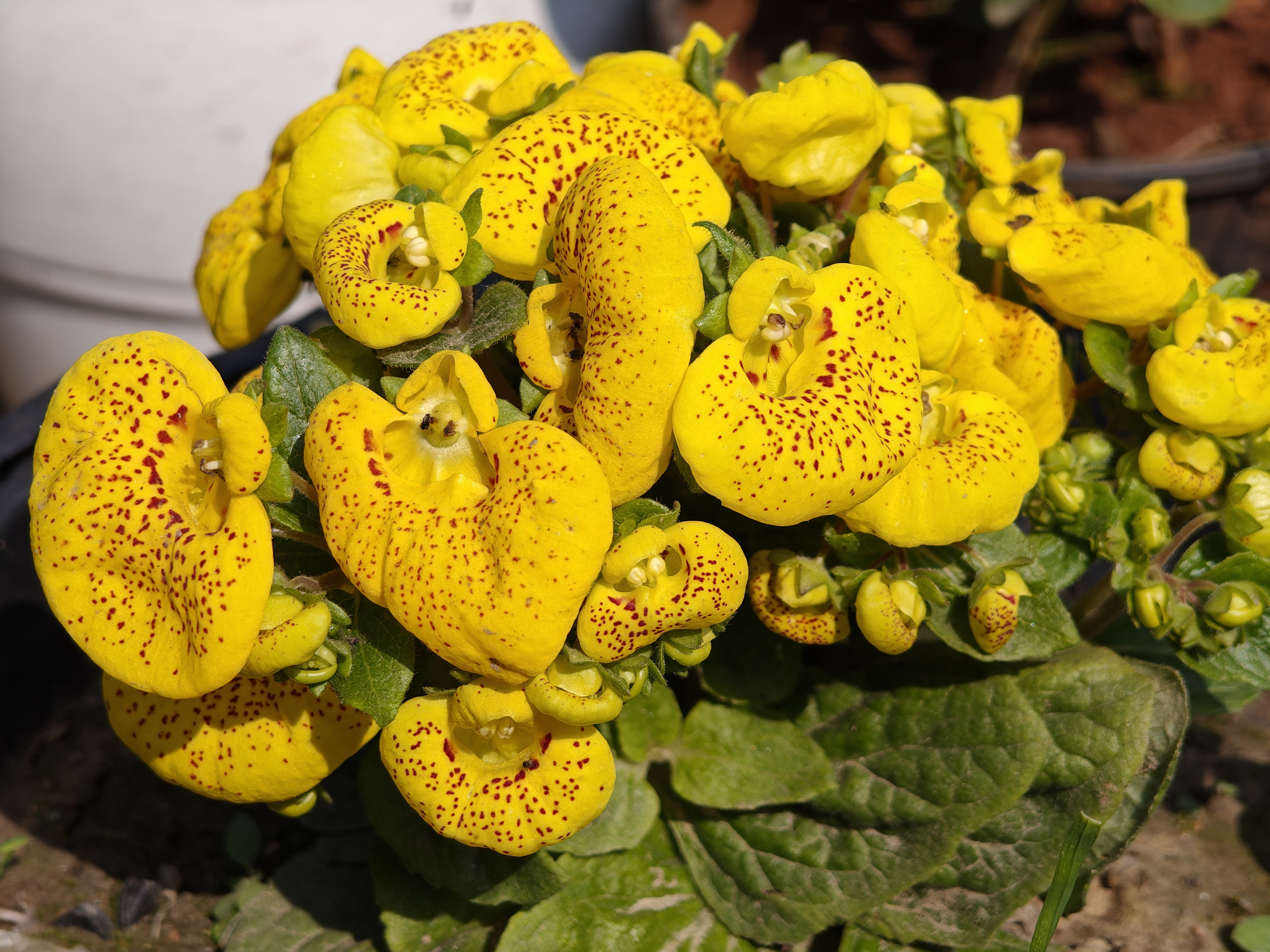 The flowers of this plant are a stunning example of nature's artistry. Their lower lips (petals) are puffed out and balloon-like, giving them a pocket-like appearance. These flowers are typically bright yellow, orange, red, and deep maroon. Often, these flowers have small brown or purple spots, further enhancing their beauty. Its leaves are large, velvety, and dark green.