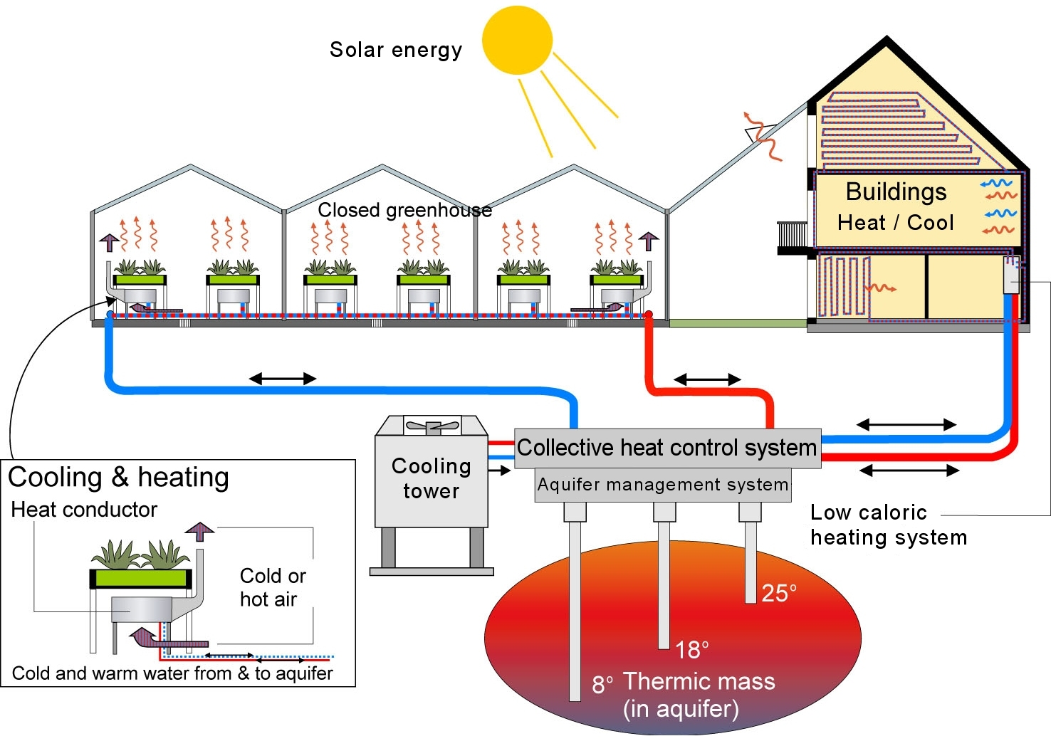 Thirst of all think about the warmth of the sun that a greenhouse captures. A grower needs in the summer cool air, because of the high temperature and in the winter he needs warm air because of the low temperature. Why not combine that and collect the warm air in the summertime. Store that warm air in a huge tank and use it in the winter again. This is a 'natural' way of heating the air in your greenhouse. But that is not everything because the greenhouse collects that much heat that he can make elecktricity as well for the entire neighbourhood. That means that he is earning money with his optimalized greenhouse.