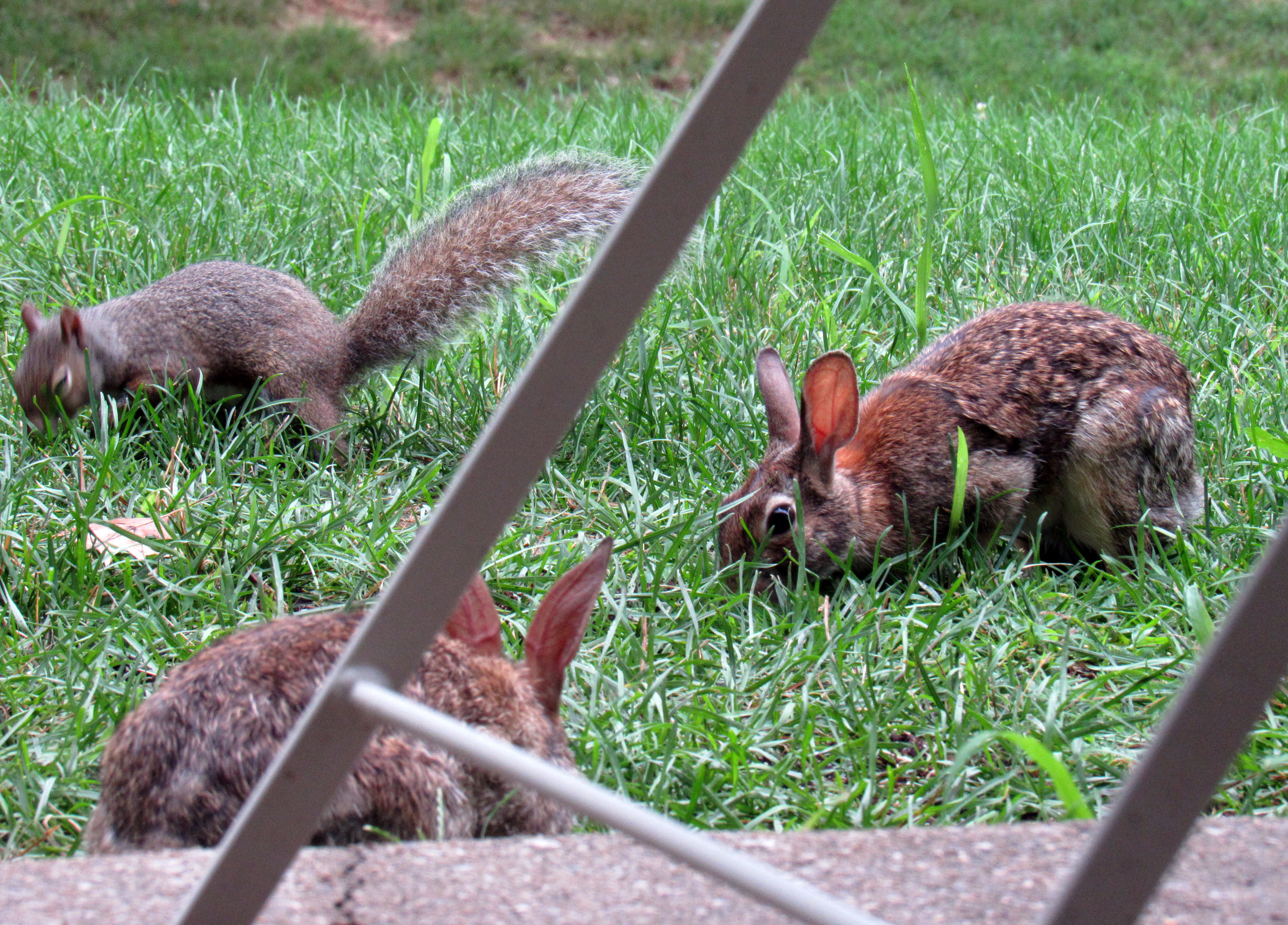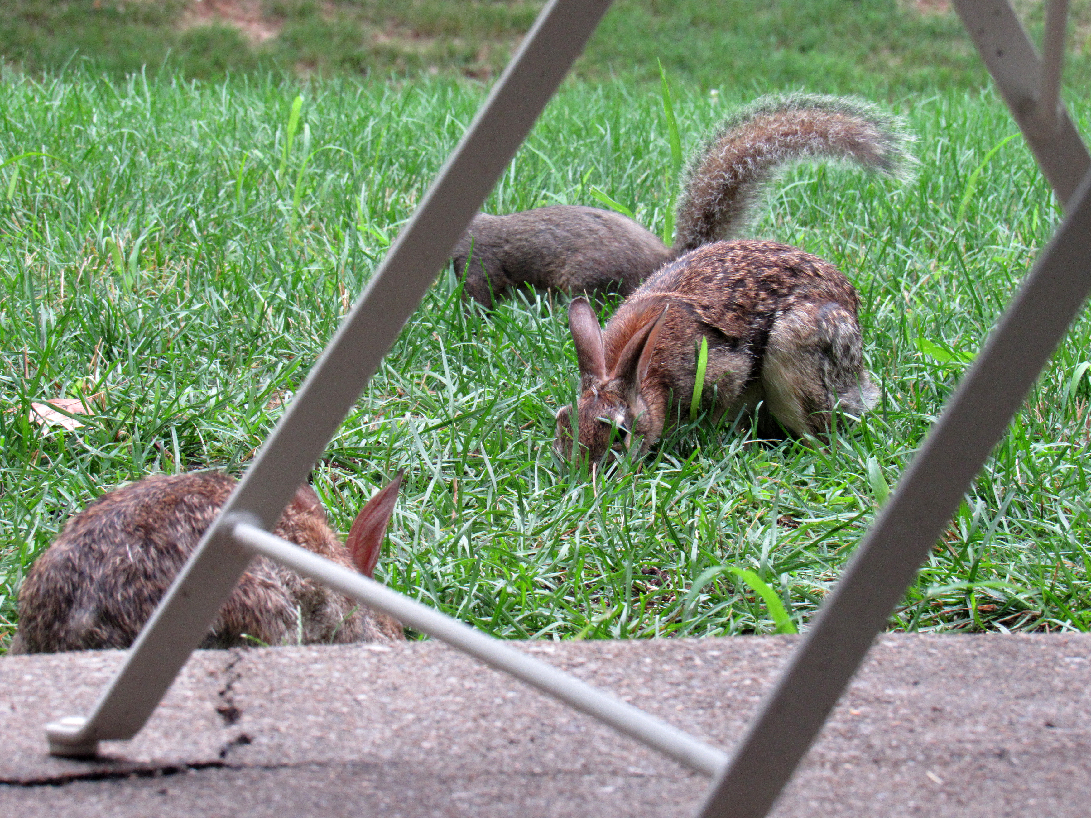 We have a regular rabbit who visits us at dawn and dusk and of course, many squirrels that stop by throughout the day. But it's not every day that we have two rabbits show up! And the squirrel adds some spice to the party. As you can see, this all went down in the grasses right outside my patio.