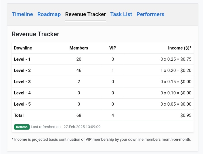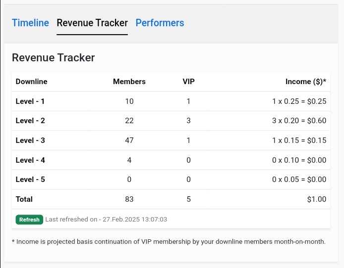 Таким образом благодаря тому, что мой спонсор был полноценным участником клуба имел статус "VIP-Membership", он получает благодаря активным действиям нижестоящих партнеров получает самоокупаемость ежемесячной подписки и накапливает средства на балансе от своей работы и серфинга.