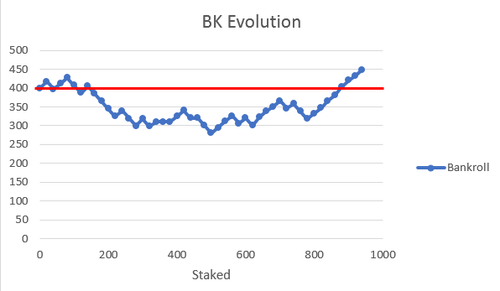 The next objective are to reach 500 units int the BK to step up to a betting amount of 25 units. Of course it works the other way around too, and I will decrease the betting amount if the BK goes down.