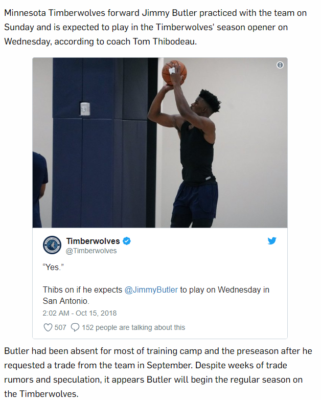Butler spoke to the media after practice on Sunday. According to Jon Krawczynski of The Athletic, Butler was asked if he expects to be booed by the Timberwolves fans during the team's home opener on Friday.
