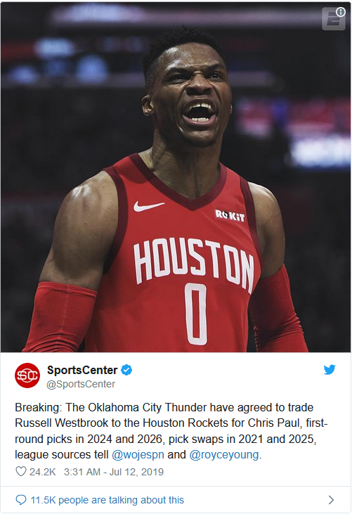In the NBA, Russell Westbrook, the MVP of 2017 and the Oklahoma City symbol, is being sent to Houston for Chris Paul and a host of future draft picks.