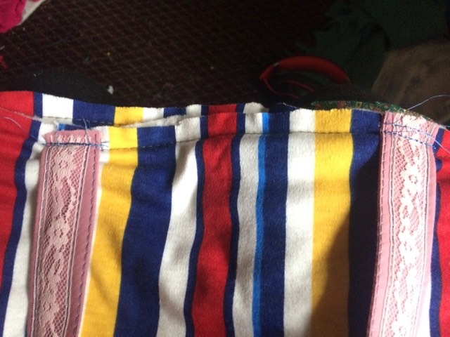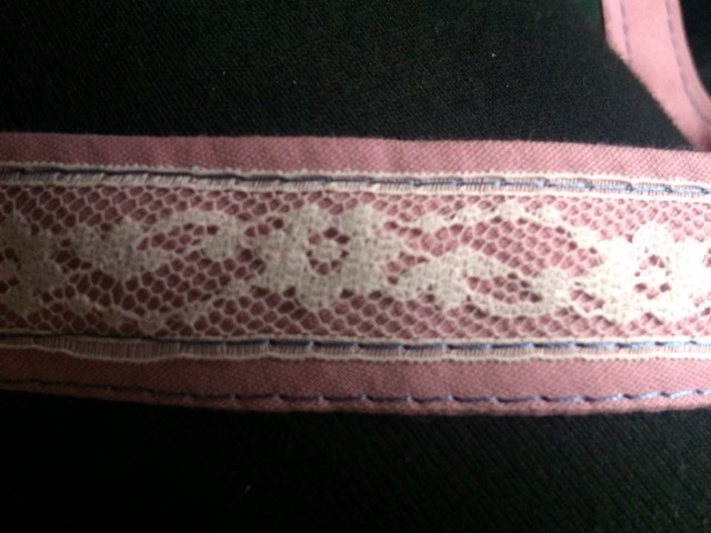 Next is the straps. I used bias tape with a thick ribbon sewn in the middle to reinforce it. This step is optional: Sew a piece of lace down the middle of the straps. Now, sew on the straps (I found that sewing them on upside down and then flipping them up after the bias tape has been added works quite well). Sew on the bias tape to cover the top of the bag. The bag is now finished!