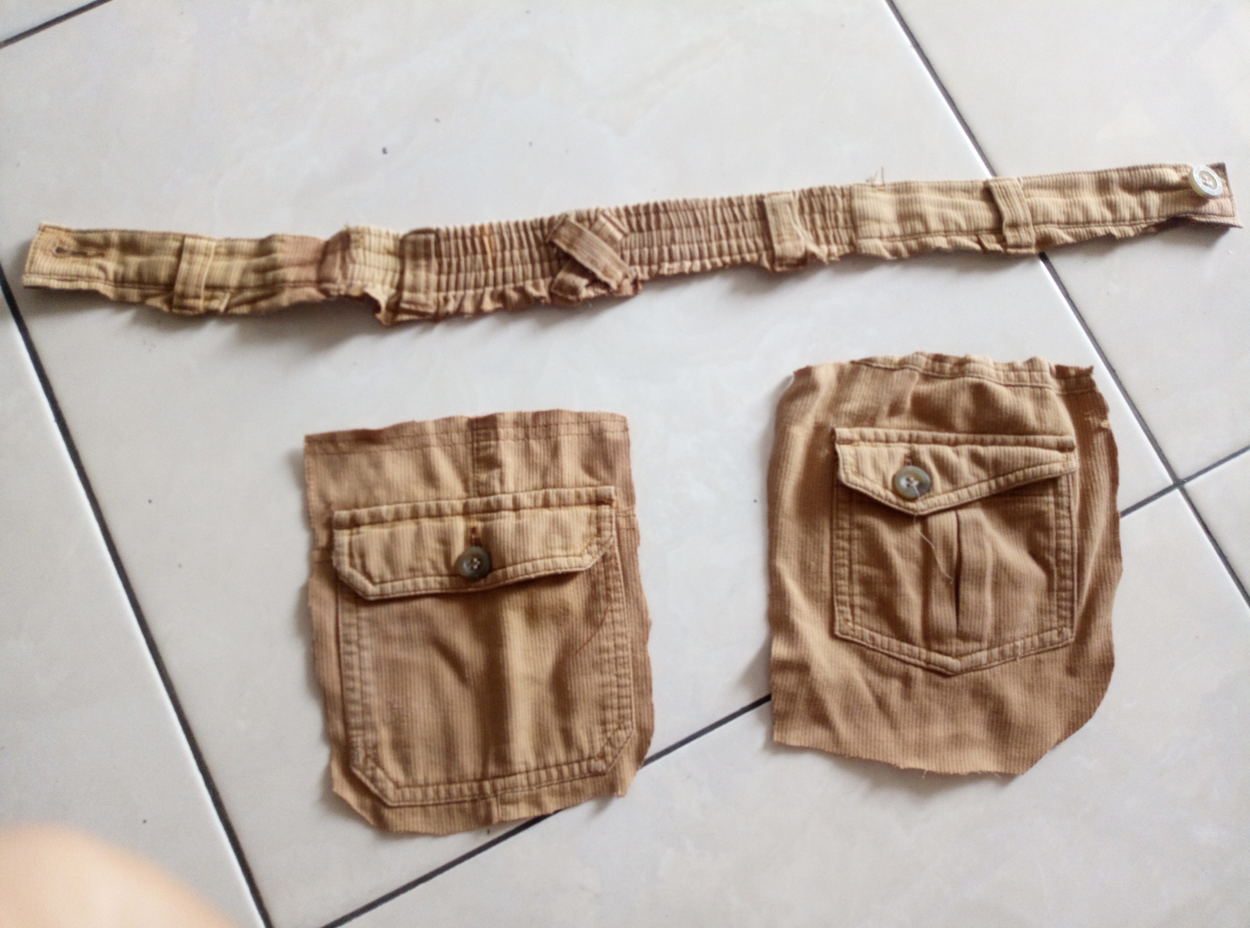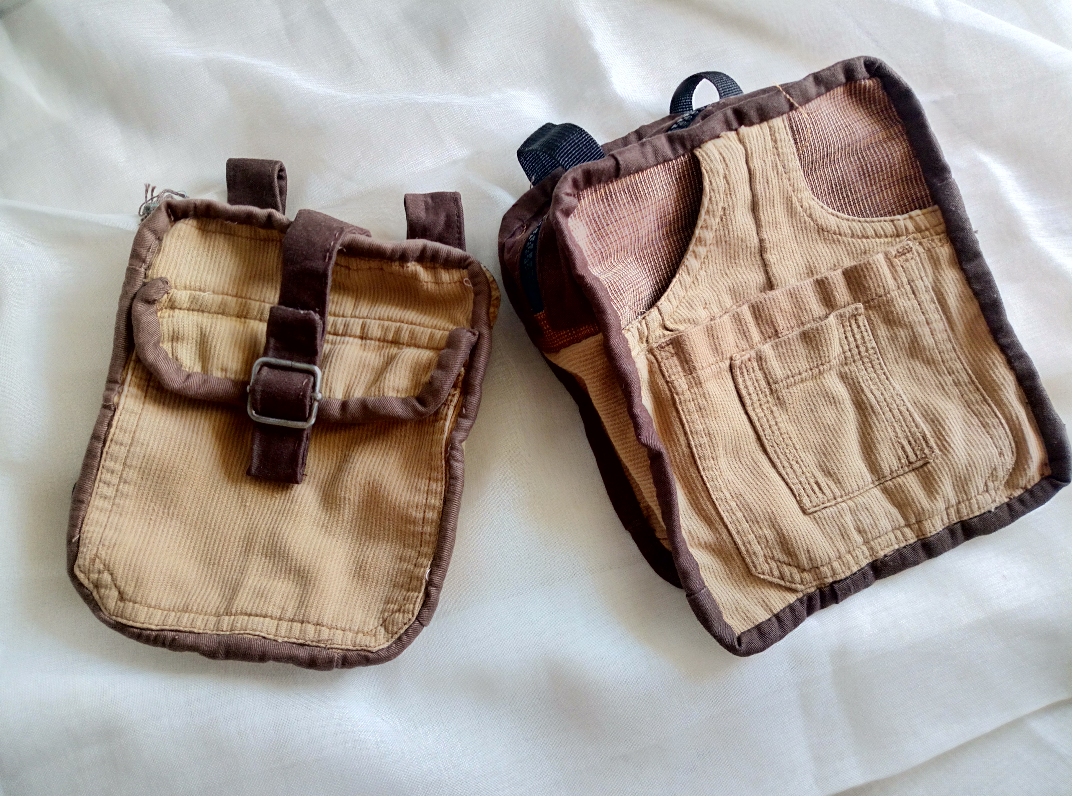 This was my son's cargo pants I sewed into 2 bags that could hang around the belt.