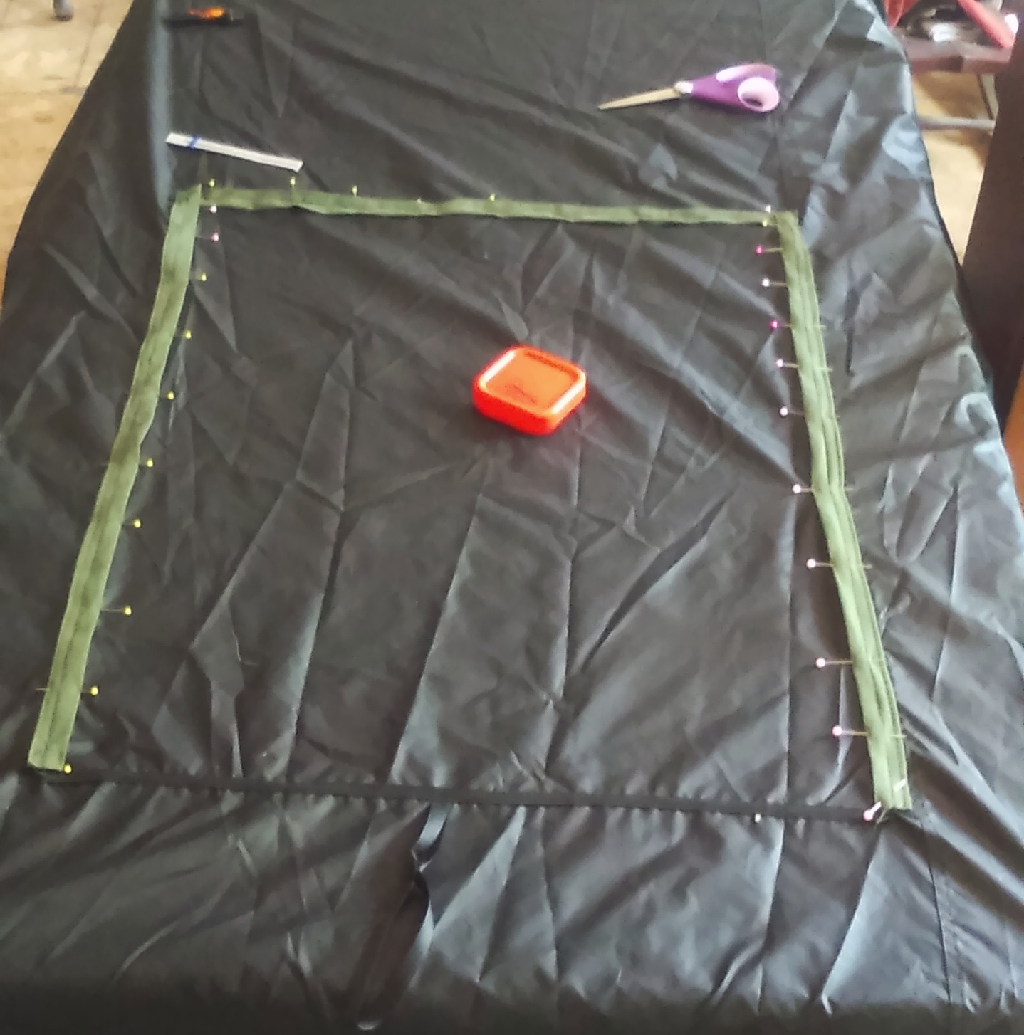 Pictured above is the "hook" side of the velcro pinned onto the material. I defined each window this way on three sides. I ran two rows of stitching to secure it to the tenting.