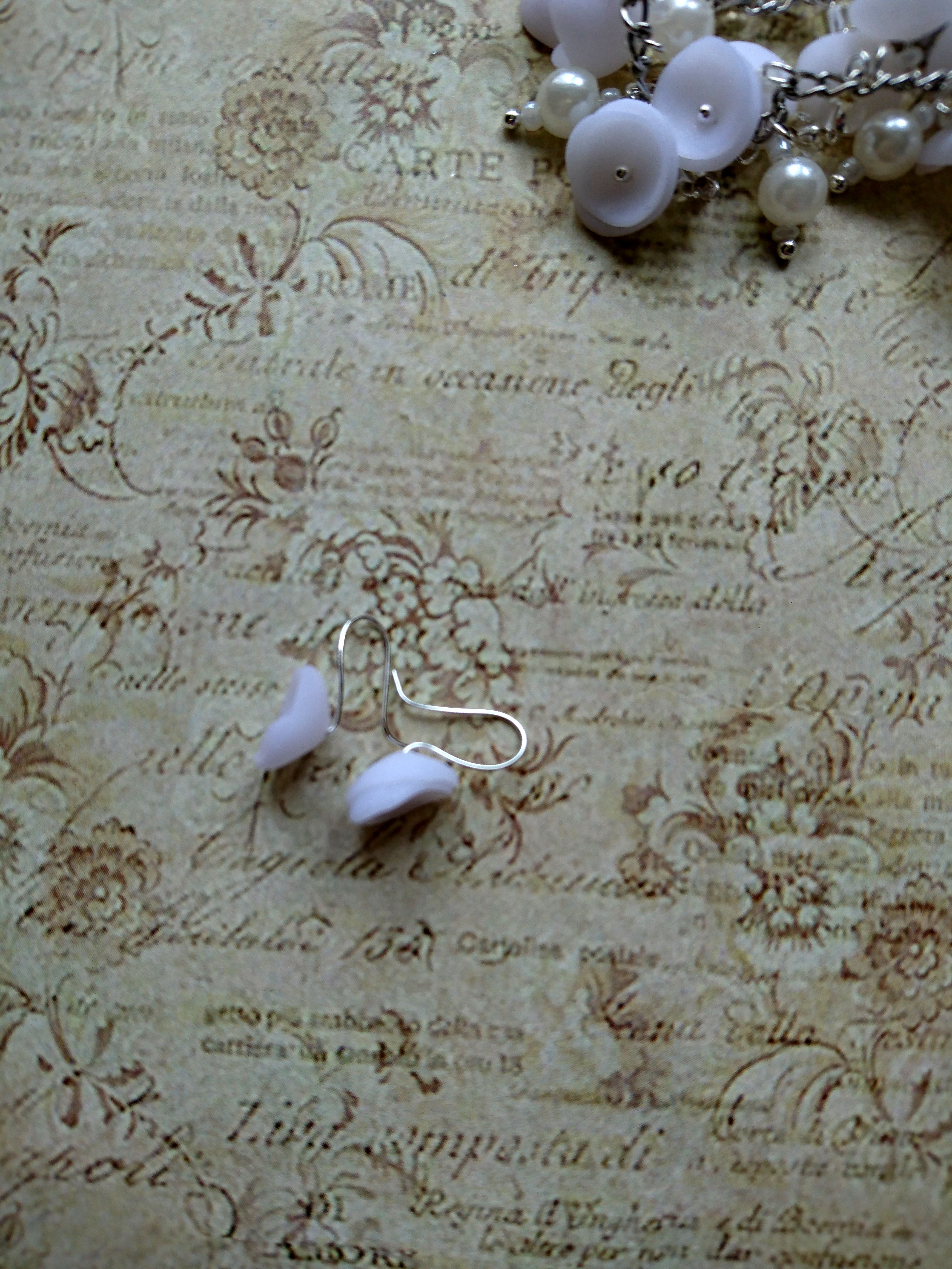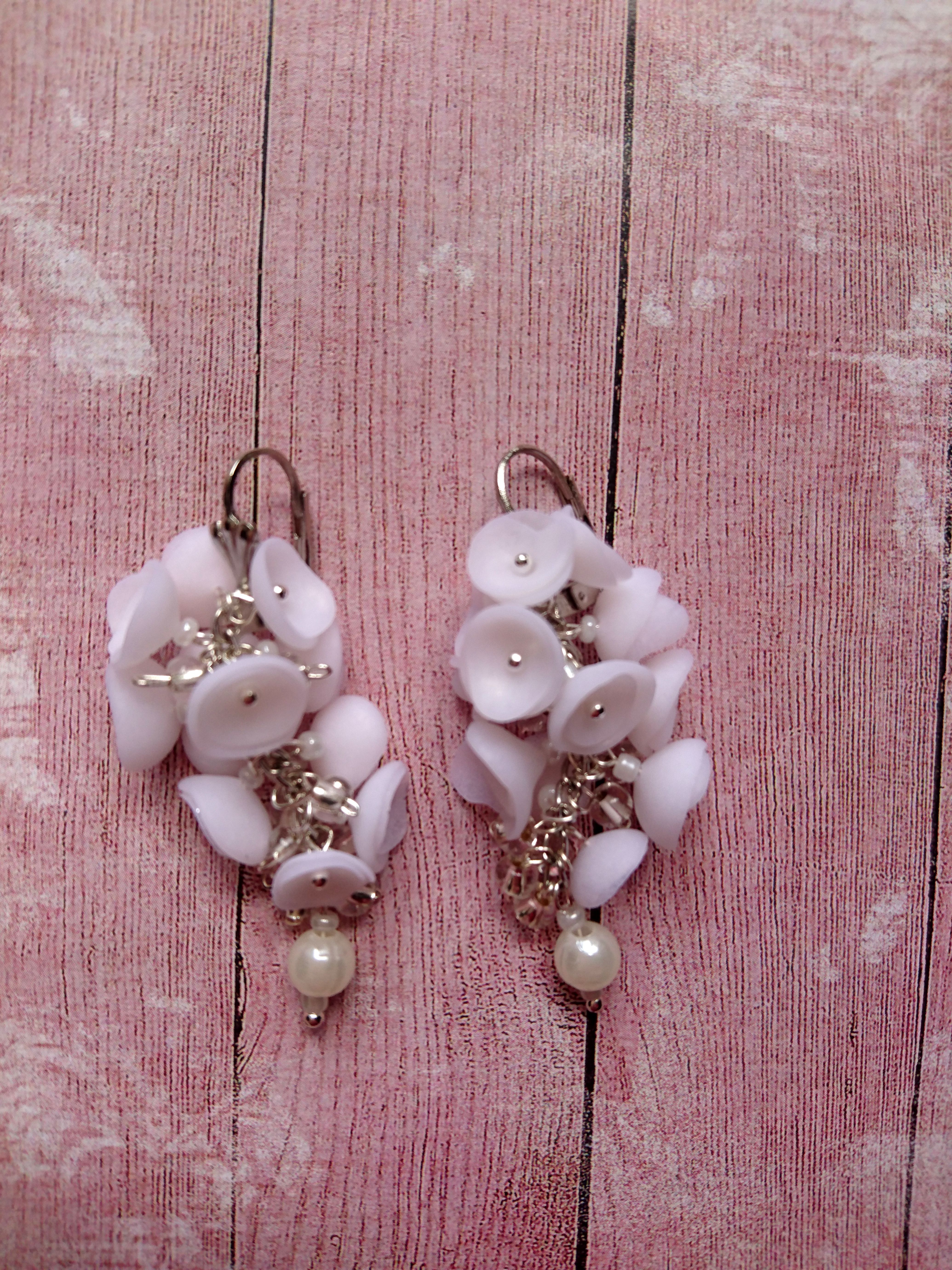 Сначала возникла идея серег в виде грозди. Но чем же её наполнить? Пробовала много разных вариантов, пока не получился самый-самый нежный. Это миниатюрные элементы в виде "тарелочек", которые сложены одна на другую и вместе одеты на иглу с шариком на конце.
