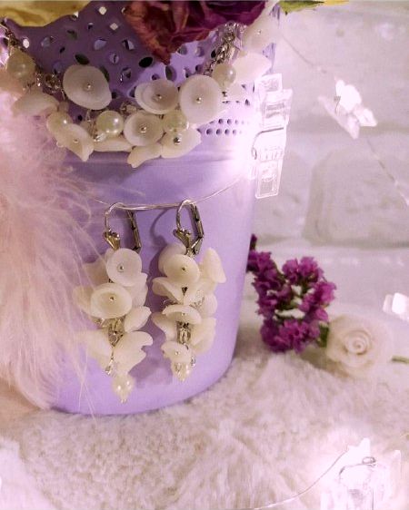 After baking, they solidify the polymer clay. Jewelry remained quite fragile, so you need to wear them carefully. And they look gentle and beautiful. The bride was very pleased. Earrings and bracelets of my work perfectly complemented her wedding look. I am very glad that I was able to help brighten her important day!