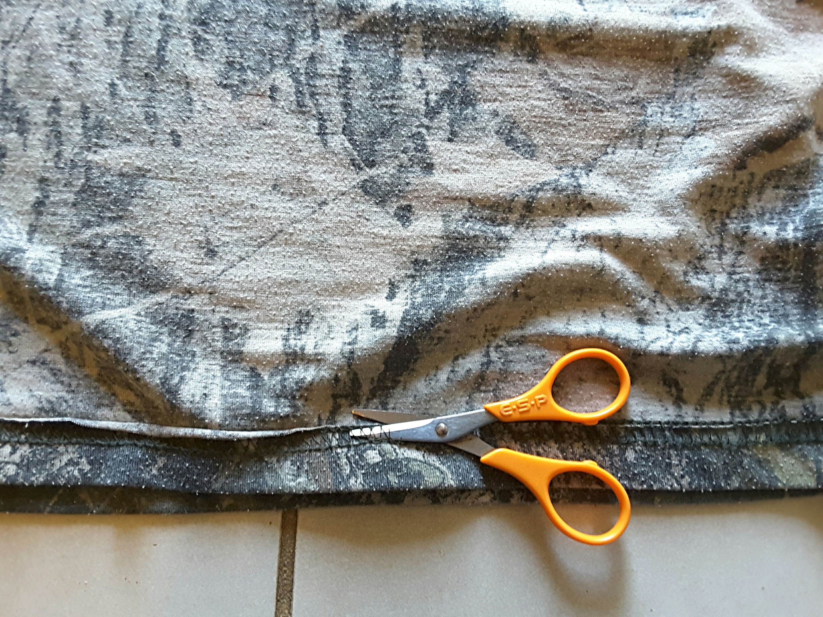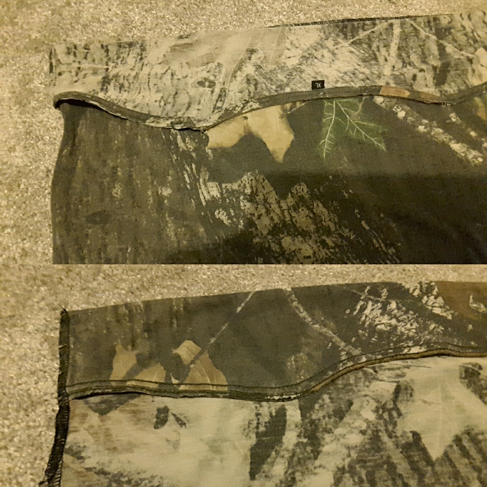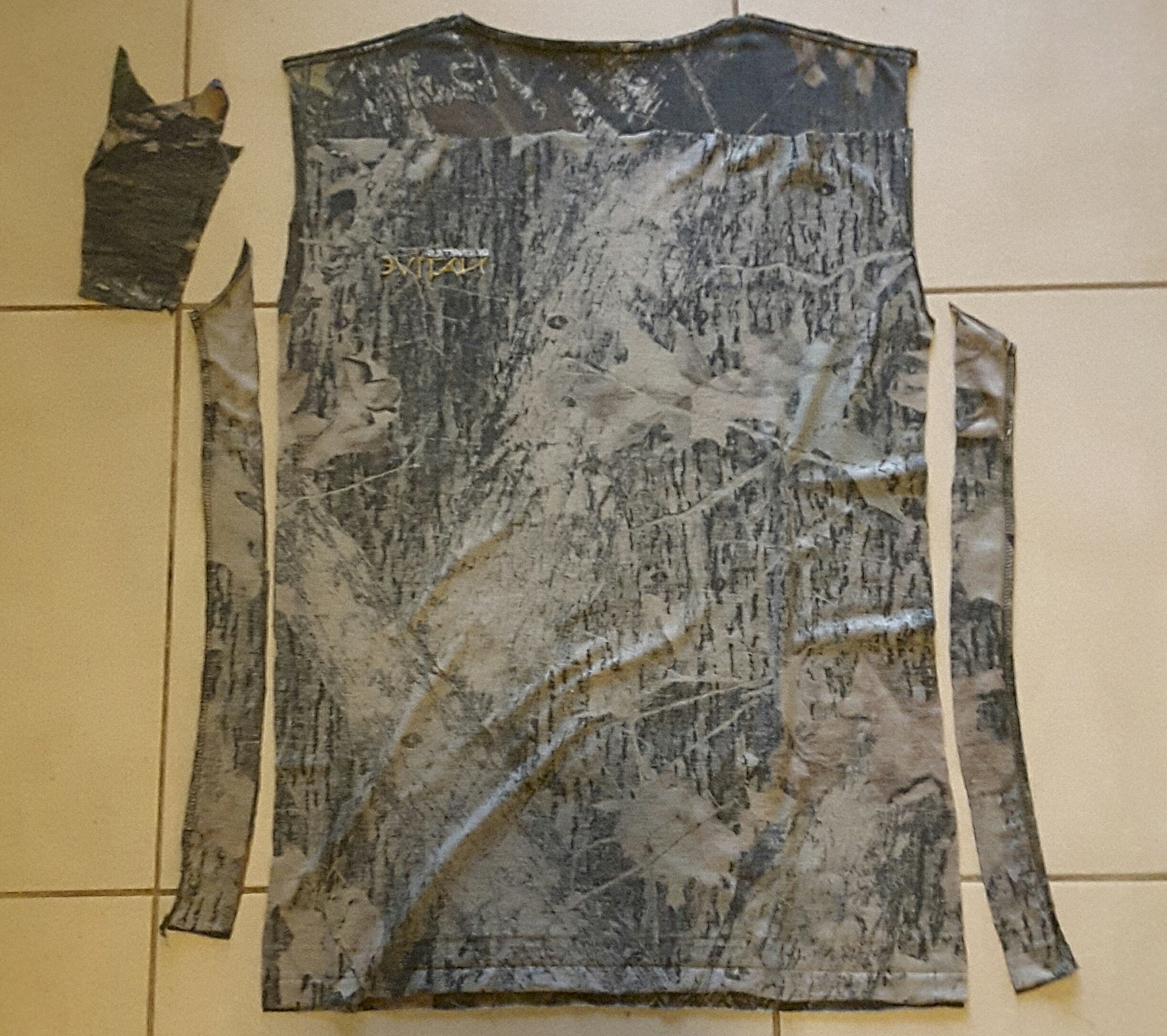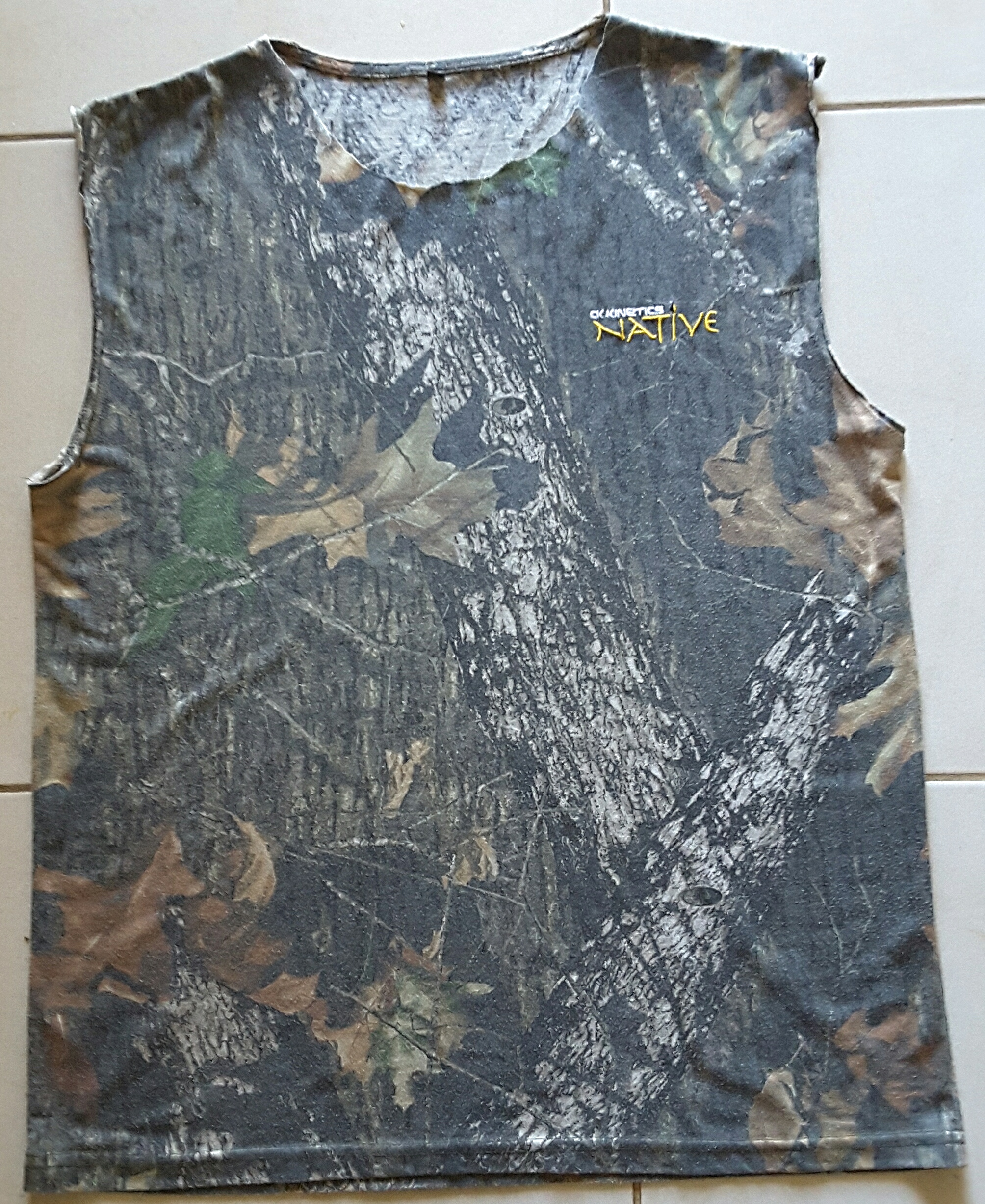 One particular favourite of his is in Real Tree camouflage, but the collar lost its elasticity and went saggy, so he cut it off. At some point he also cut the sleeves off, not sure why. Either way, he wasn't happy with its fit any more, but the main body of fabric was still in really good condition.