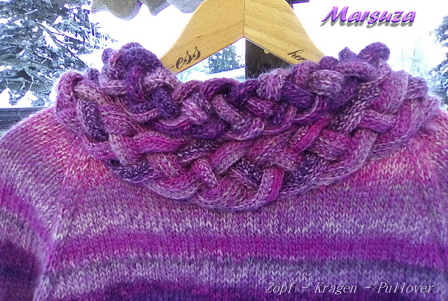 You know how to basic crochet stitches likesingle crochet and half double crochet? Wonderful, that's all it takes for this neck warmer! The instructions are in English, and there is a video where everything is explained in detail. First you make these strips, crochet them together at one end, then you braid them and finally you put a button at one end. Finished :) You could certainly also use this braid with thinner yarn as decoration in many ways - on pockets for example, or ( as shown below right ) on a sweater neckline...