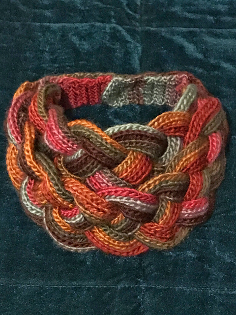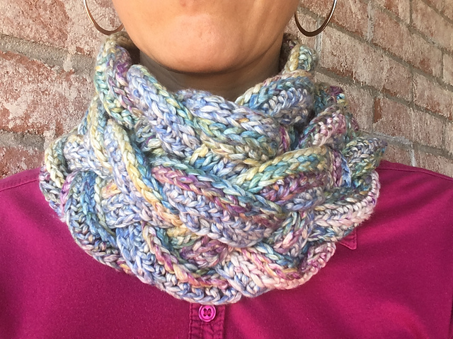 The pattern is for "worsted" yarn, but you can certainly use two thinner yarns hold together - this always gives nice color effects. Here are some of the more than 1400 braided cowls posted on Ravelry alone, with links to the Ravelry page and the image source: