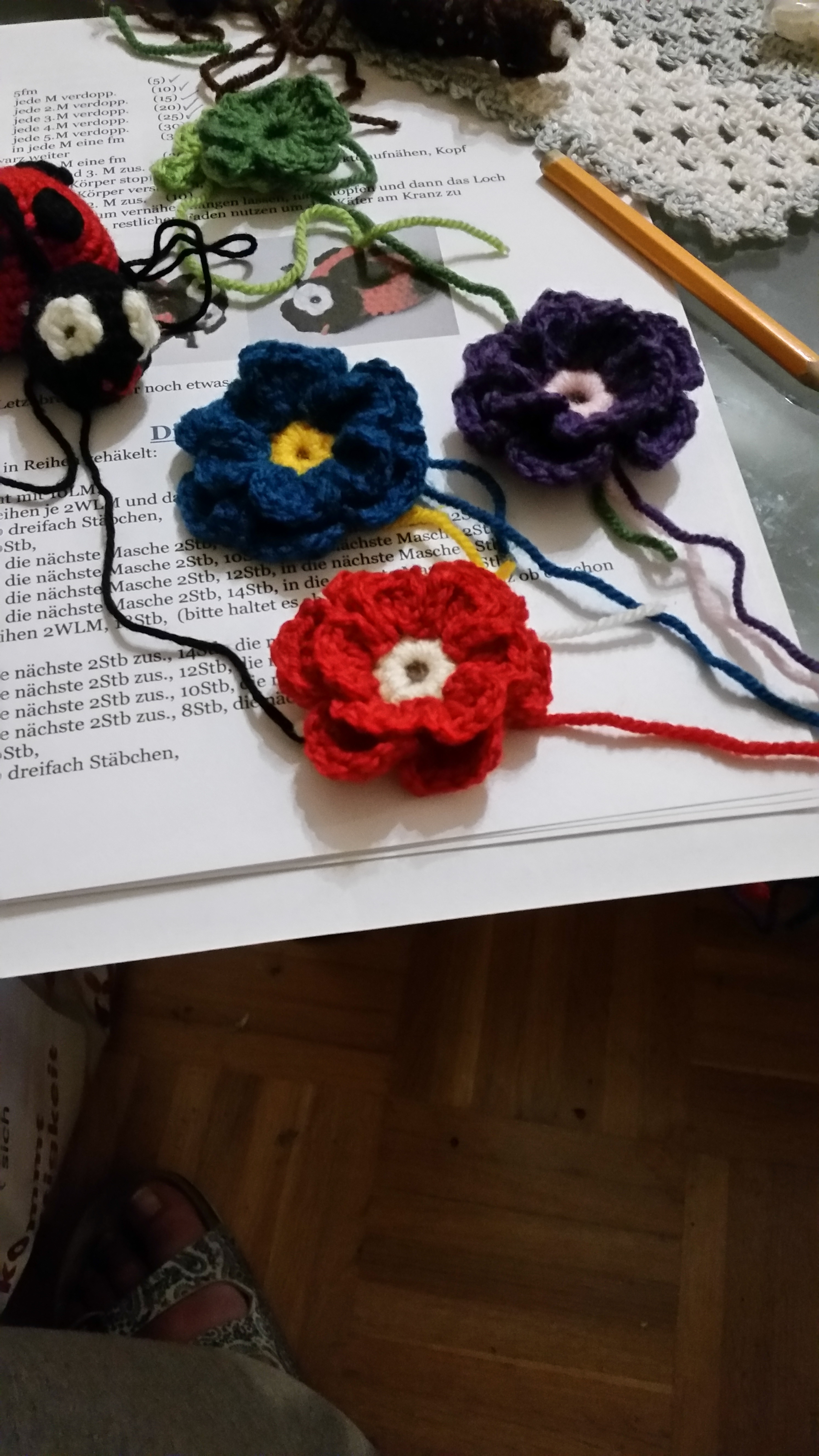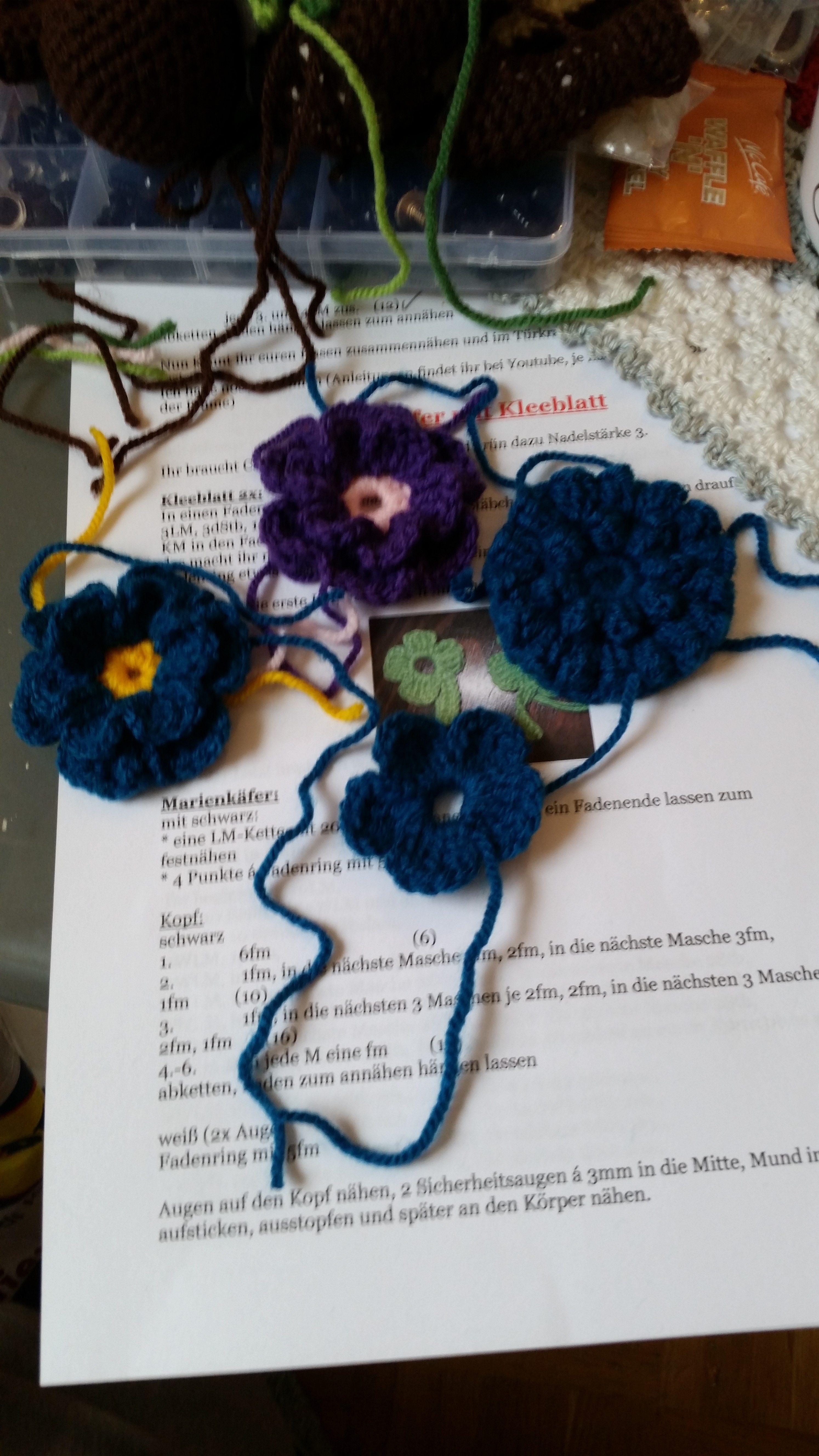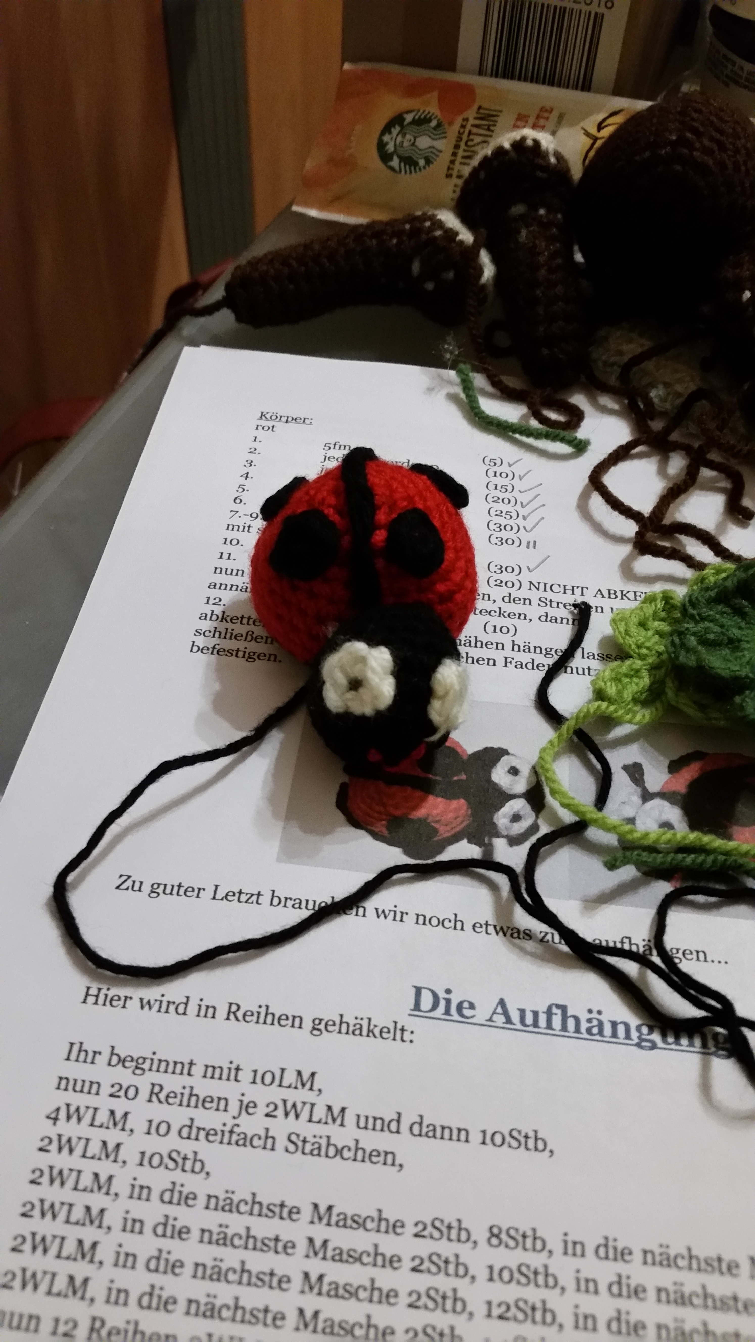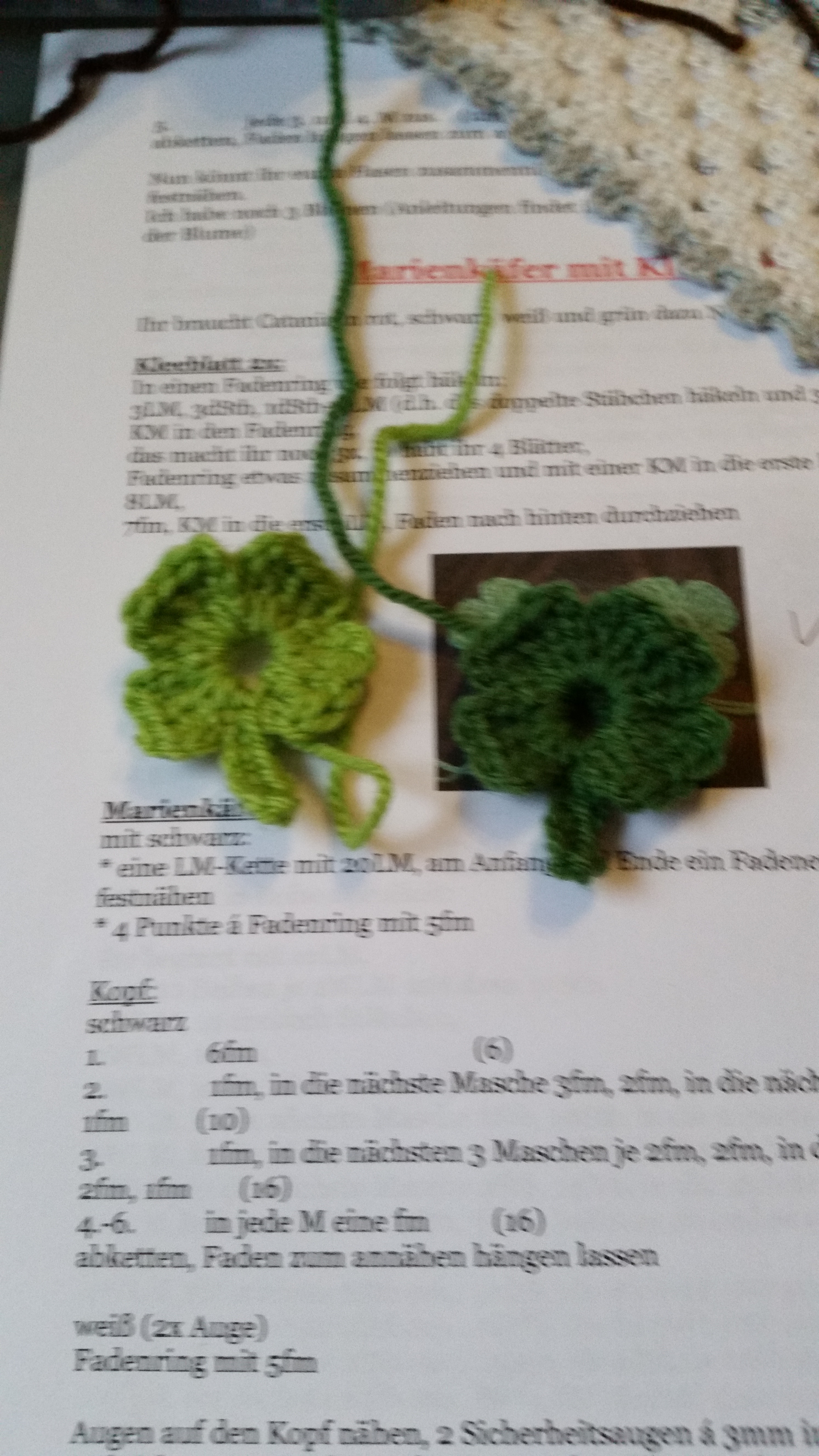 Da ich beim Häkeln nicht so gerne vernähen möchte habe ich mir einen Marienkäfer auf YouTube ausgesucht, den ich am Stück häkeln konnte und die dazugehörigen Kleeblätter waren auch gleich dabei.