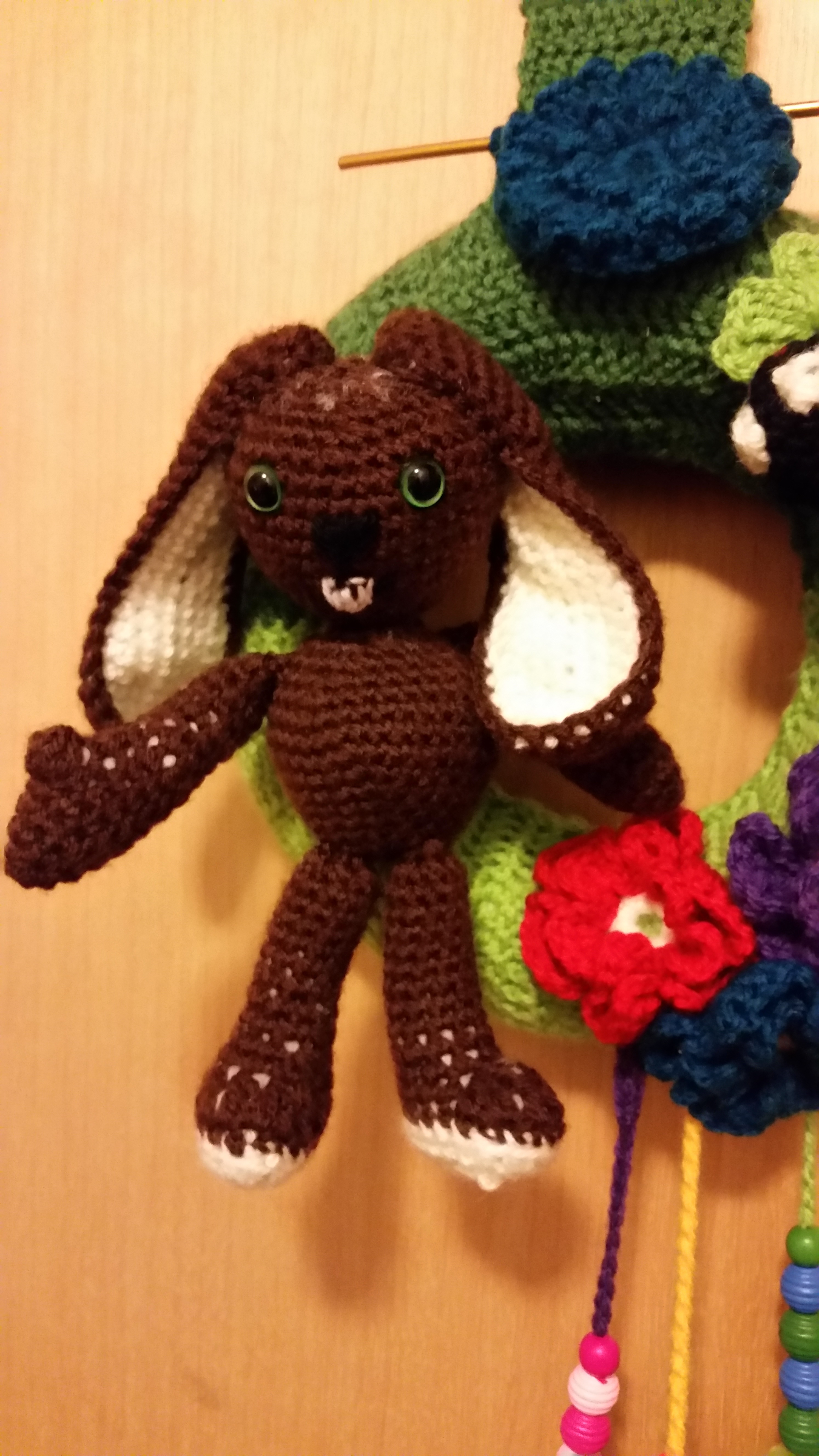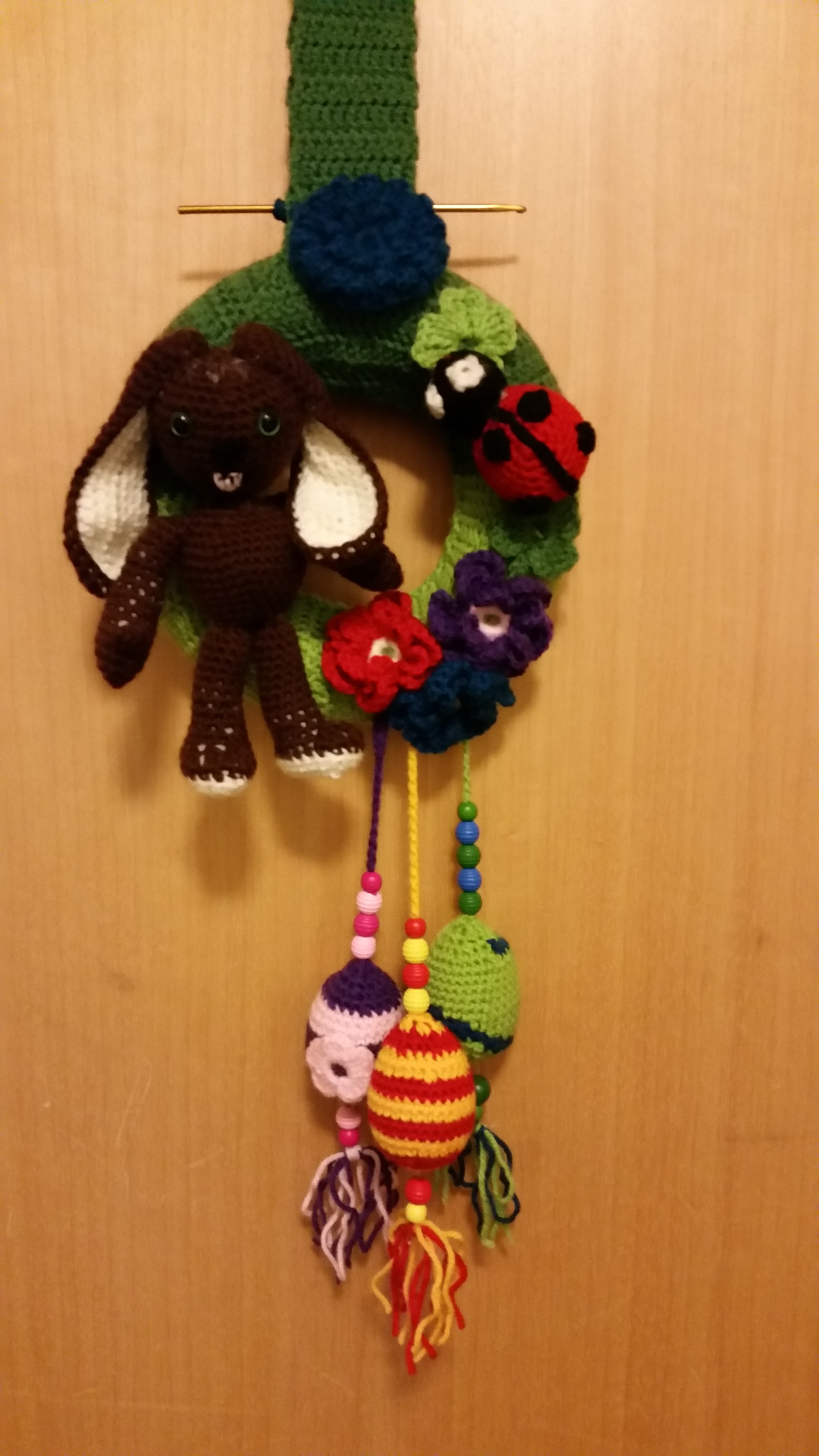 At least I crochet a big hanger for the whole door wreath with ten double crochets. I draped all to the wreath and sewed the Easter Bunny together.