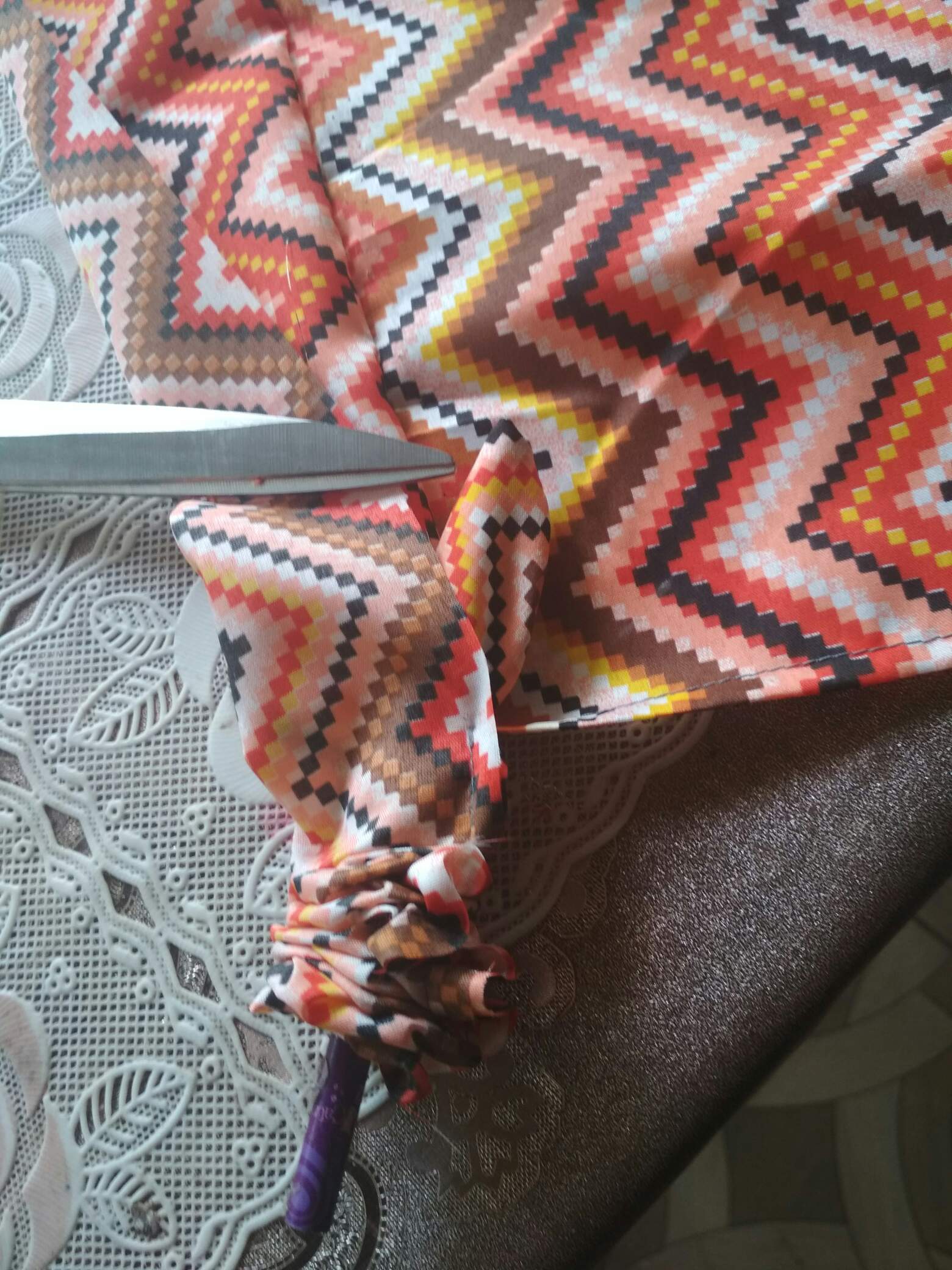 The fabric brought by my customer is 2 meters. First measure the length by 17" + 2" allowance. Cut it horizontally all the way through. The technique here is to make a sash/belt of the remaining fabric without any cut.