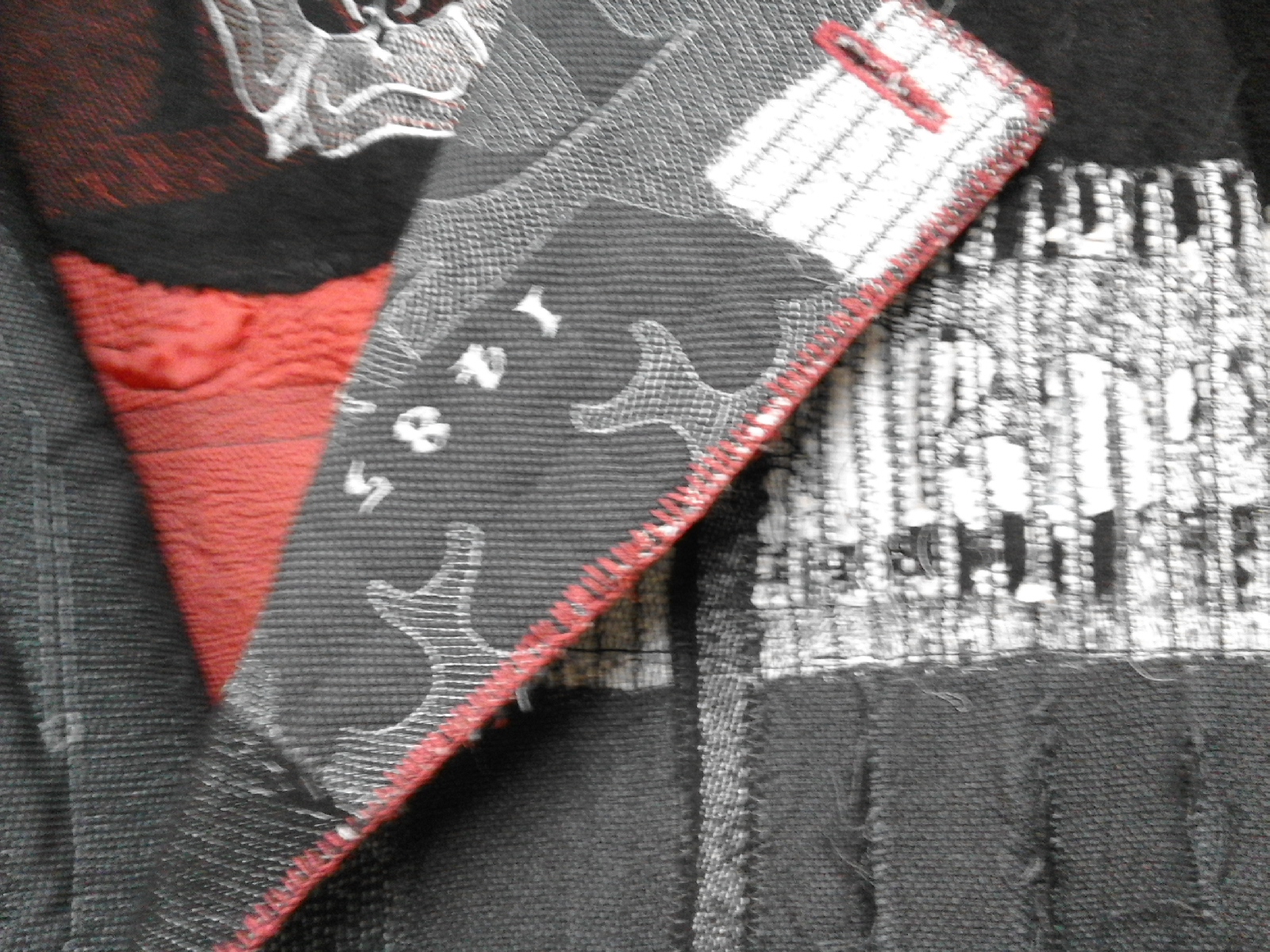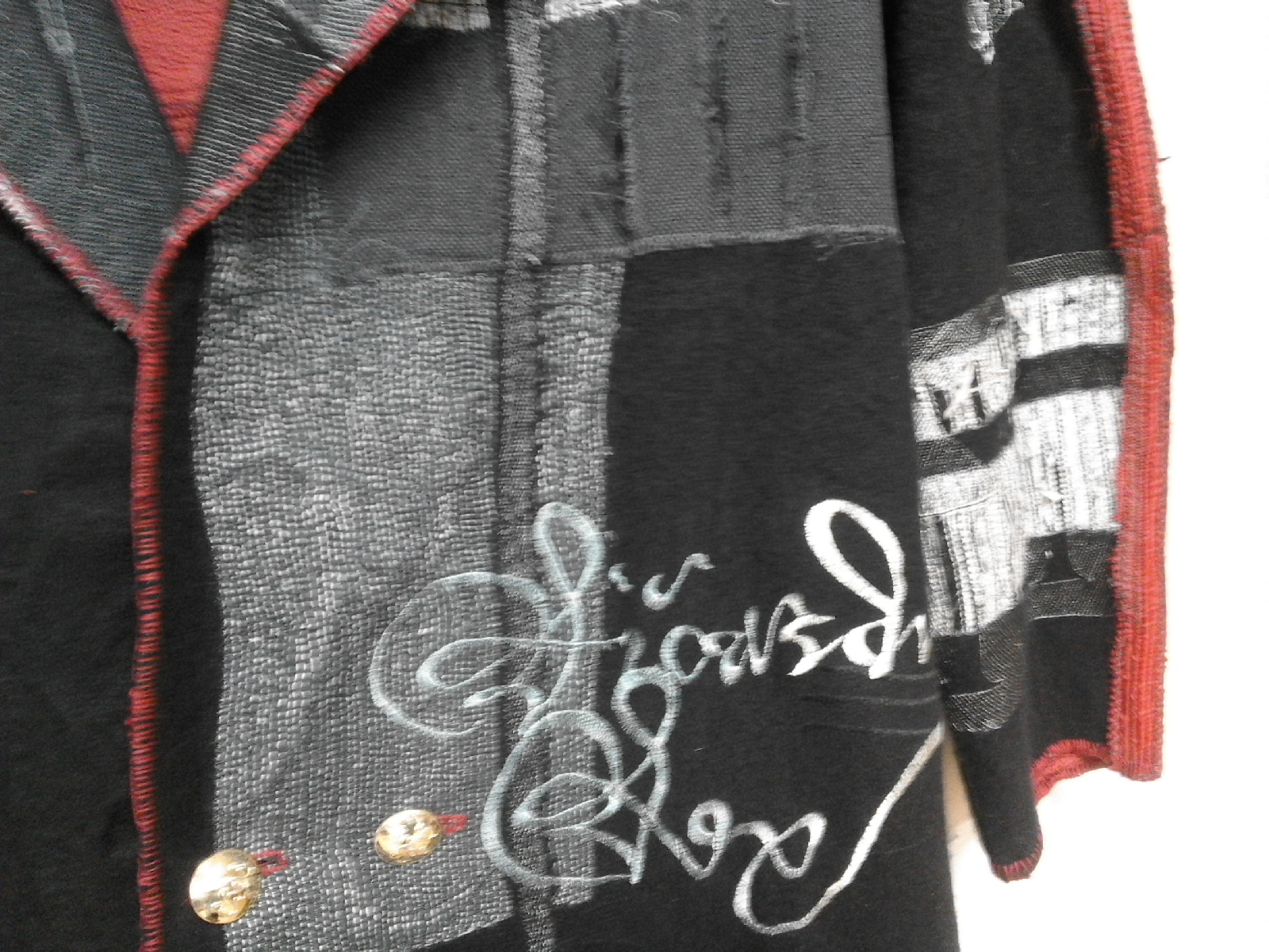 The patching and overlays, the hand-stitched blanket stitch trimming the edge, the softness of the base fabric, the stiffness and puckering of worked areas, the military brass buttons and formal regalia. No time to understand it all, greedily stroking it, trying to find its meaning, what are you saying, what are you saying, and left only with some fuzzy out of focus pictures and an inane comment to Nigel muddling up two different Civil Wars.