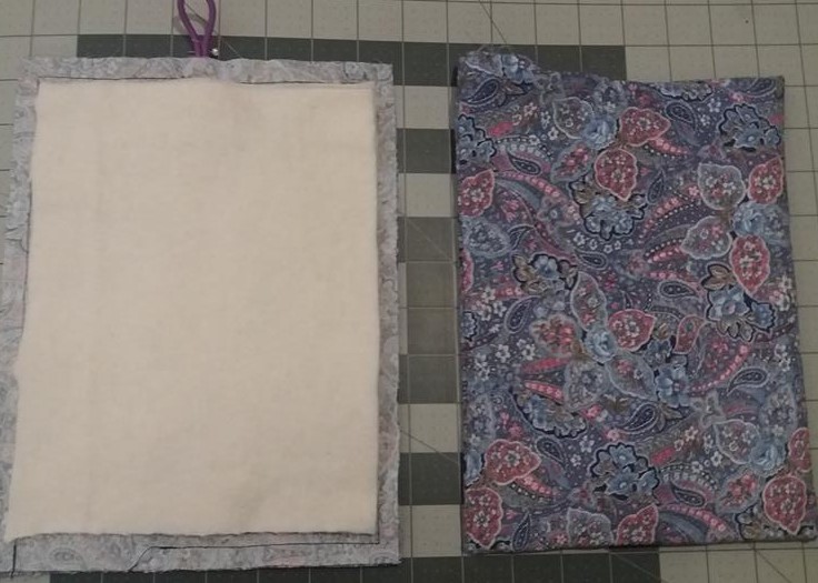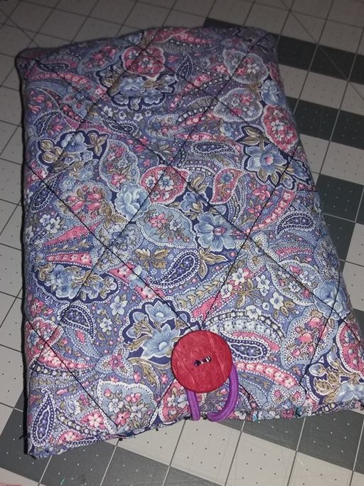When I had sewn the 3.5 sides, I turned it inside out. Then I cut some firm batting (to protect my books) and pushed it through the hole. In this photo you can see the open hole at the top on the right. I used a hair elastic on the top side of the back piece. I wanted to do a button and elastic fastening rather than magnets (purely as I thought magnets would be harder to sew in!)