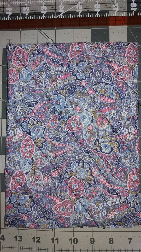 I decided to try and quilt it a little to hold the batting firmly in place. This stage actually helped me practise sewing in straight lines!!! I used an air dry marker to draw lines 2" apart and started with the middle line (corner to corner). The pen dried quickly so you now can't see it, but I did draw on the reverse side.