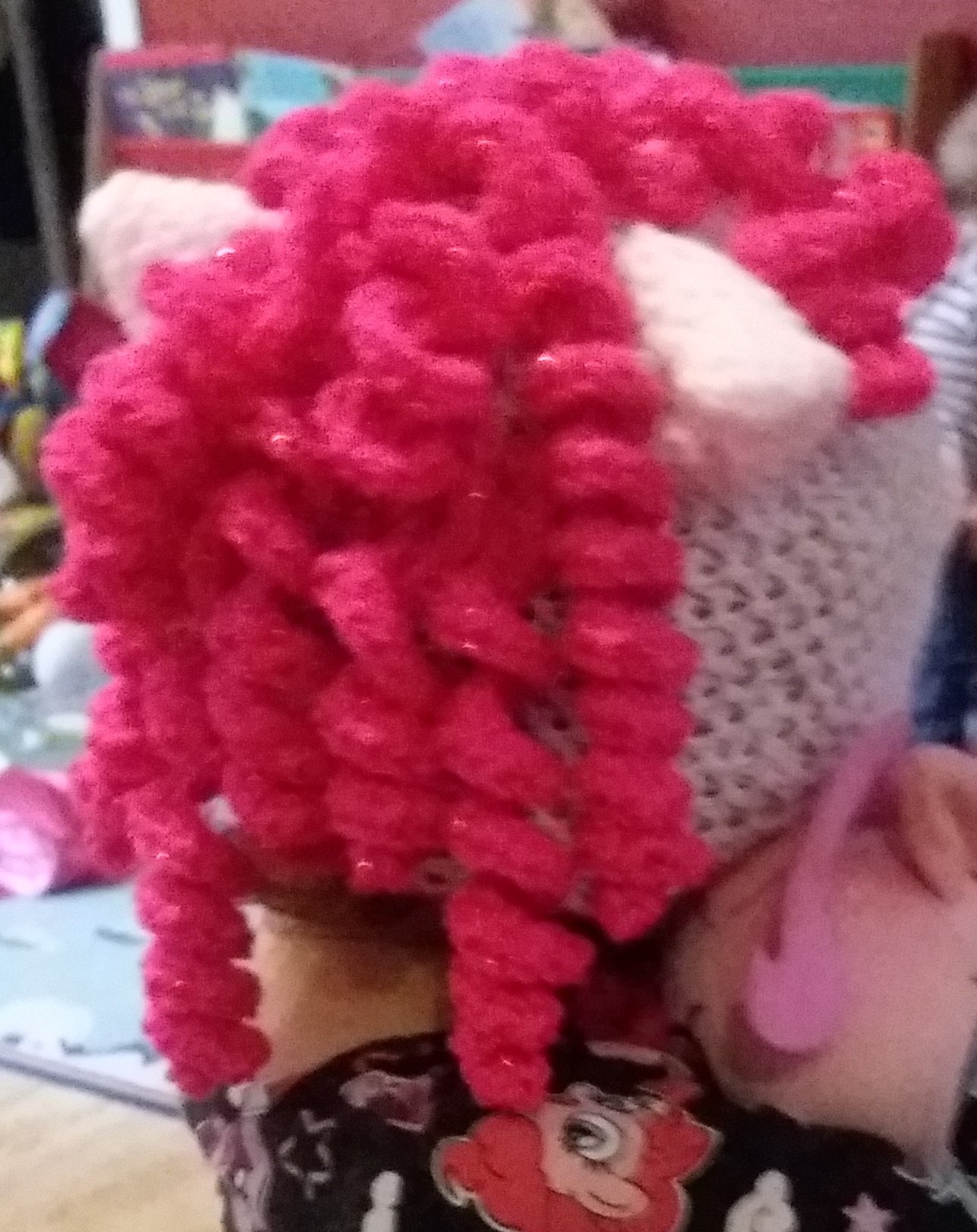 What a cute hat! Love those curly pink locks. 😀