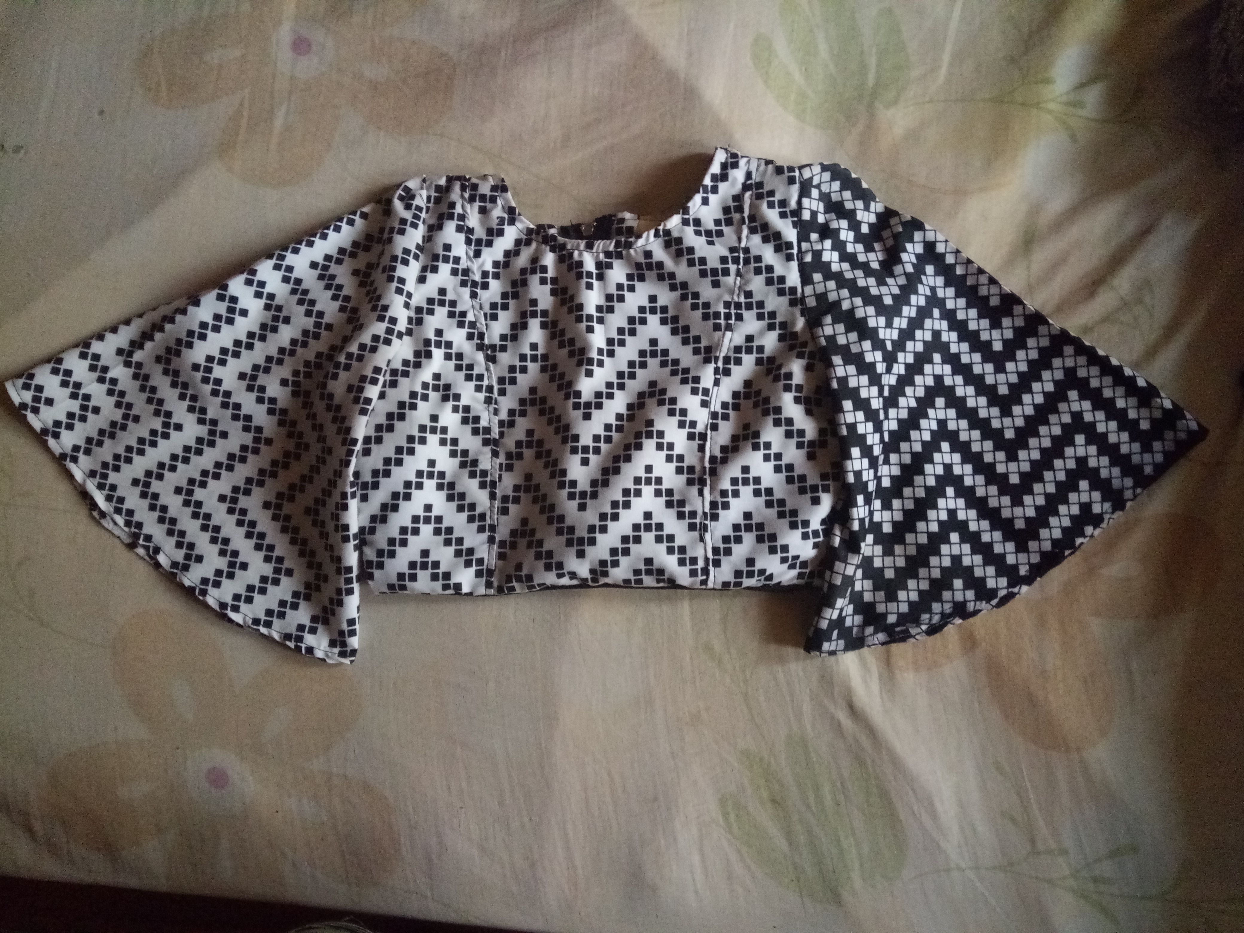 Instead of sewing the upper part outwards I sewed it inwards and added flair sleeves to it to give the butterfly look. I added a black band to make the waist look slimmer .